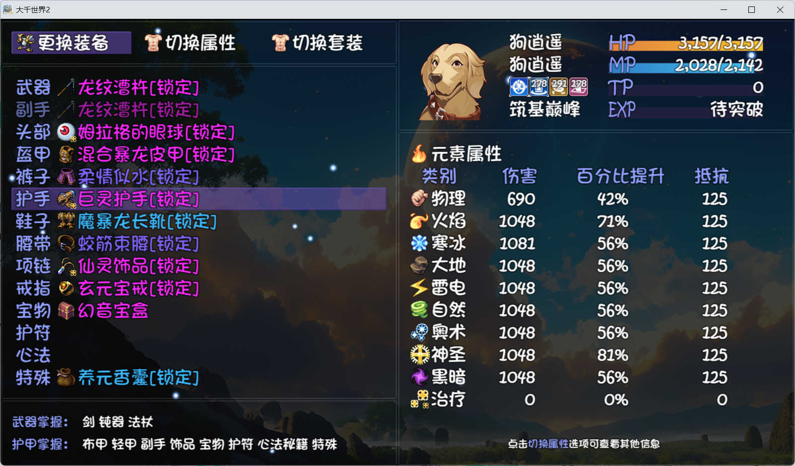 每种单独的属性对应图中1~10大家都能理解,然后是元素伤害加成,这里实际演示一遍,取消掉奇怪知识呼吸法后属性图如下