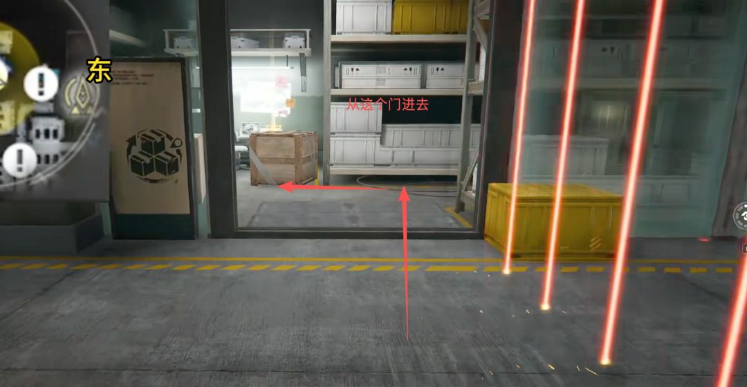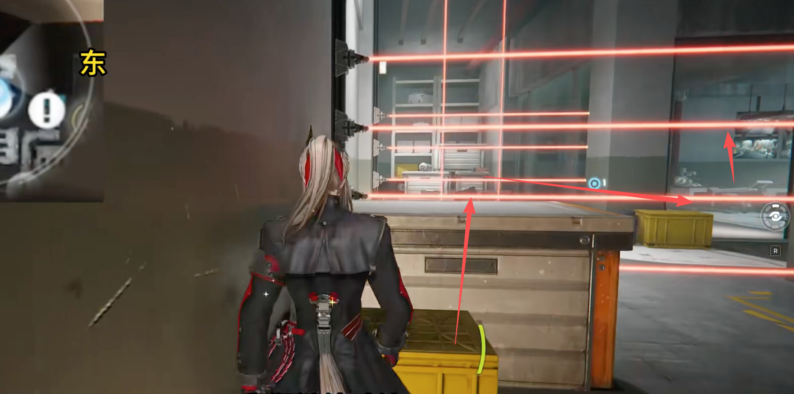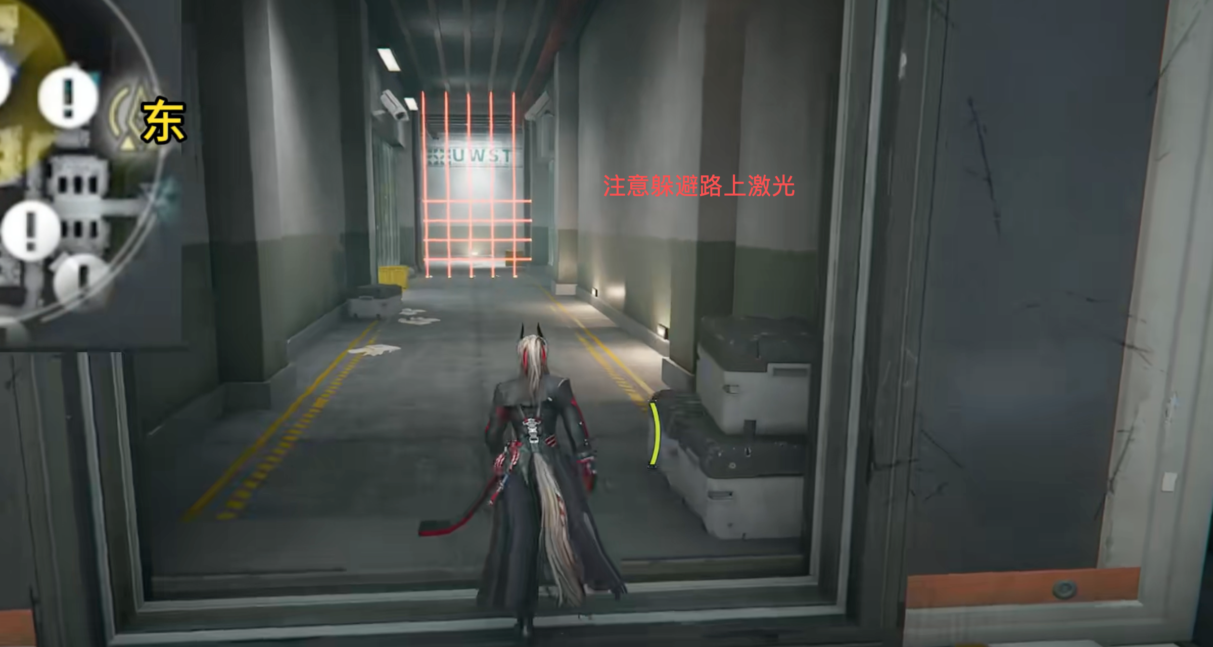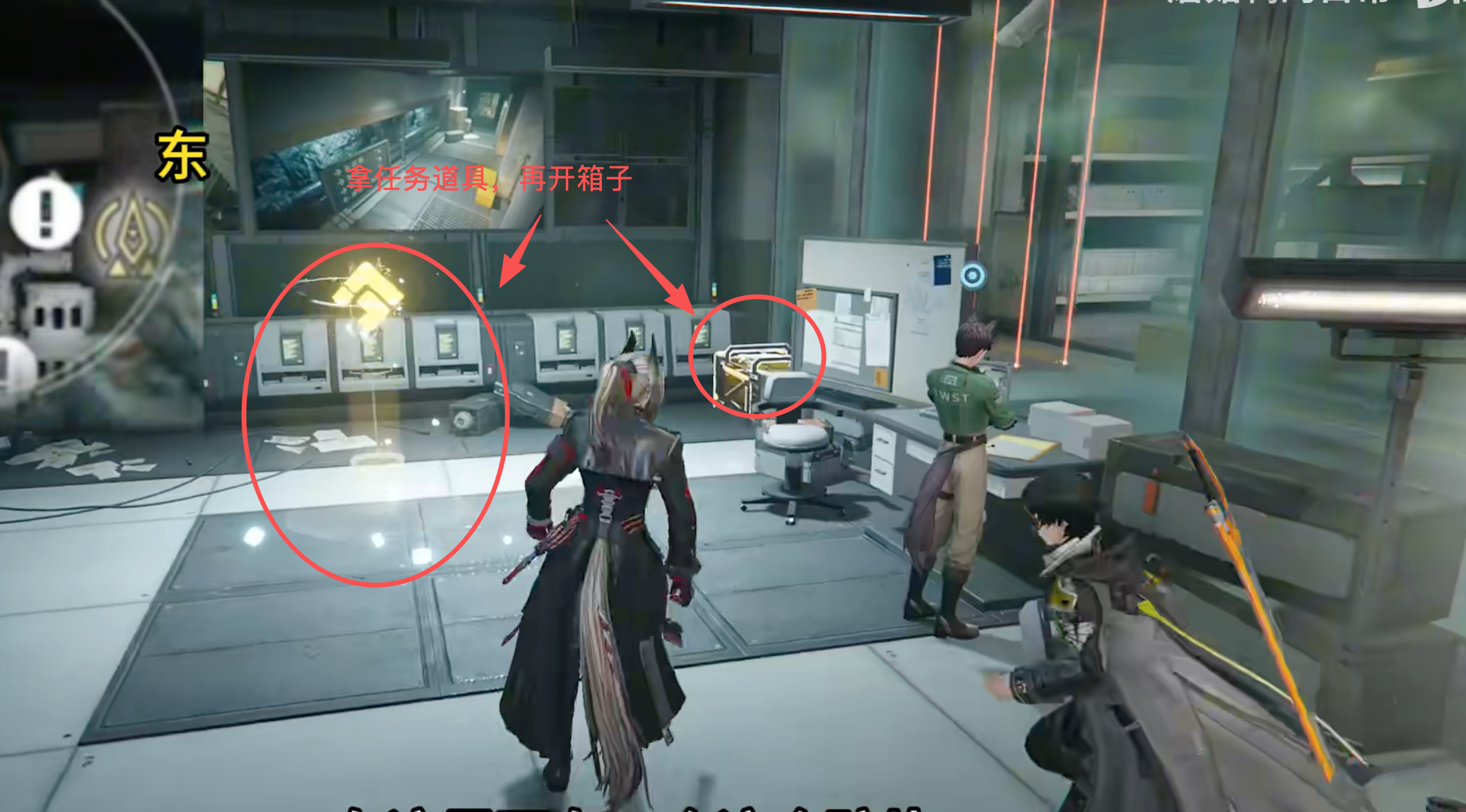 先坐电梯到地下,然后跟着图上箭头走,其中需要接“乘风”任务,一路上不要碰到激光。一条线下去可以拿3个宝箱,这个点位是第3个宝箱。