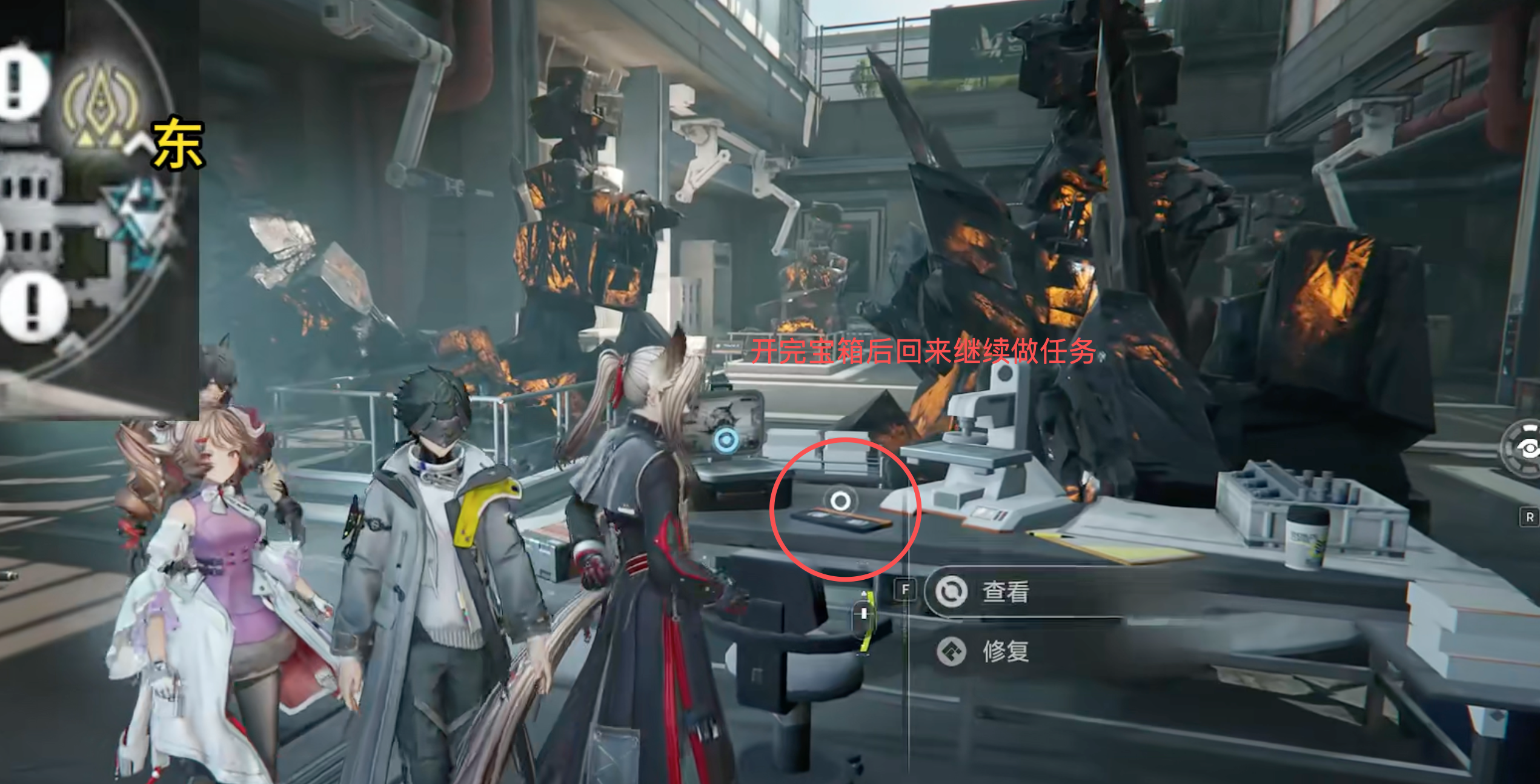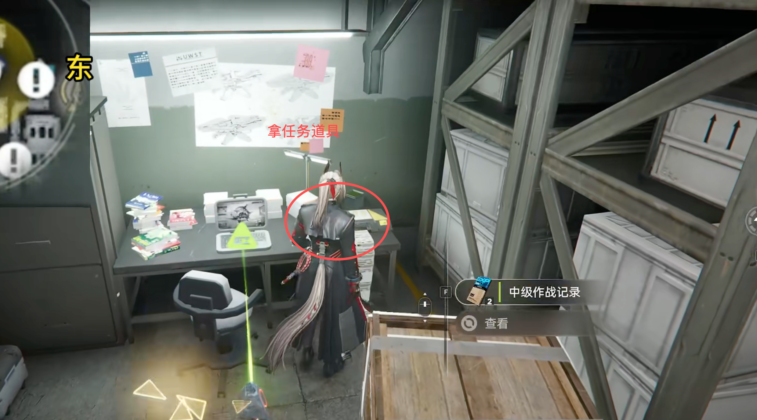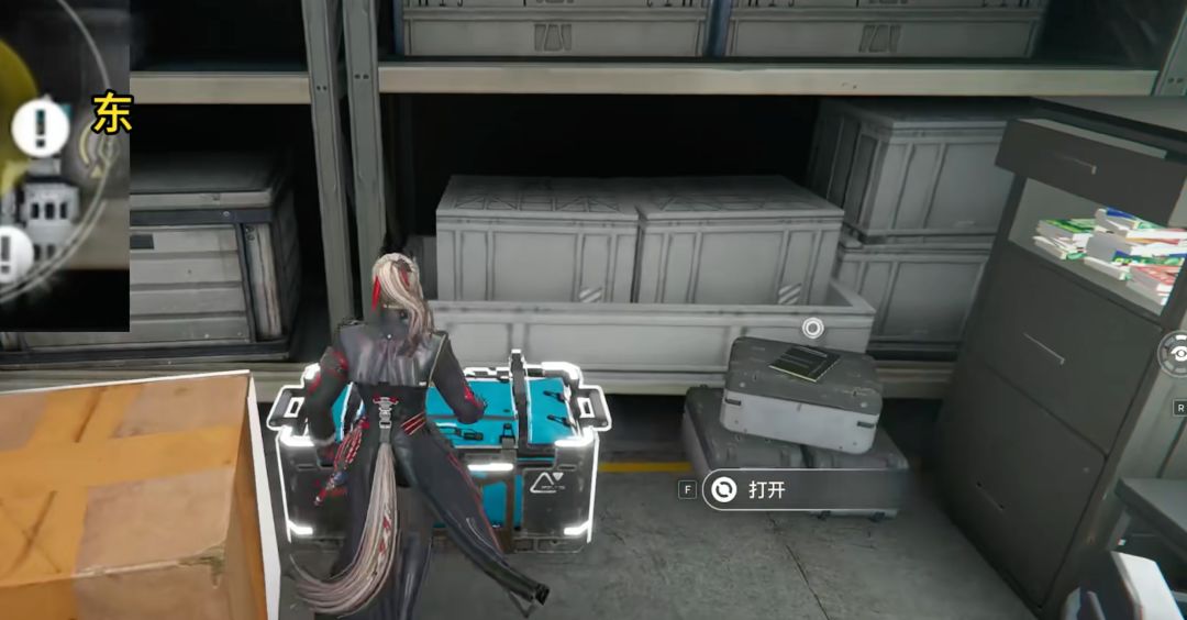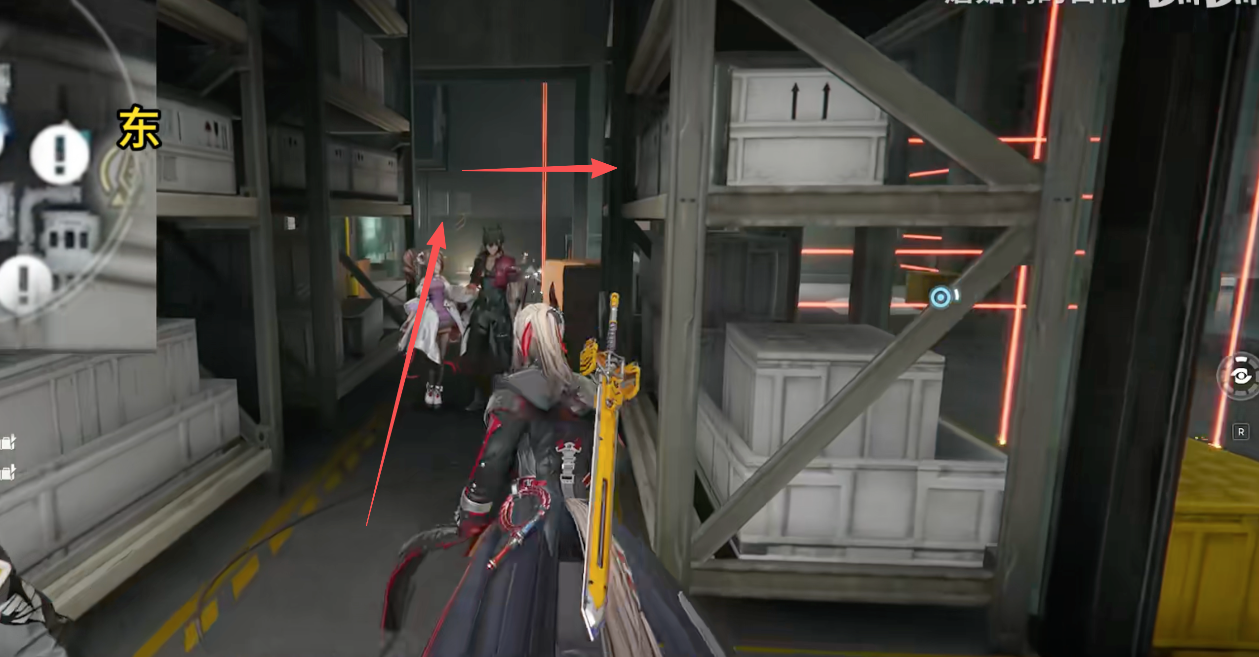 先坐电梯到地下,然后跟着图上箭头走,其中需要接“乘风”任务,一路上不要碰到激光。一条线下去可以拿3个宝箱,这个点位是第3个宝箱。