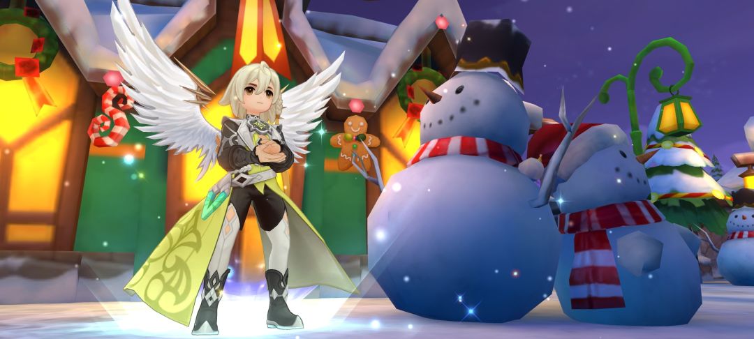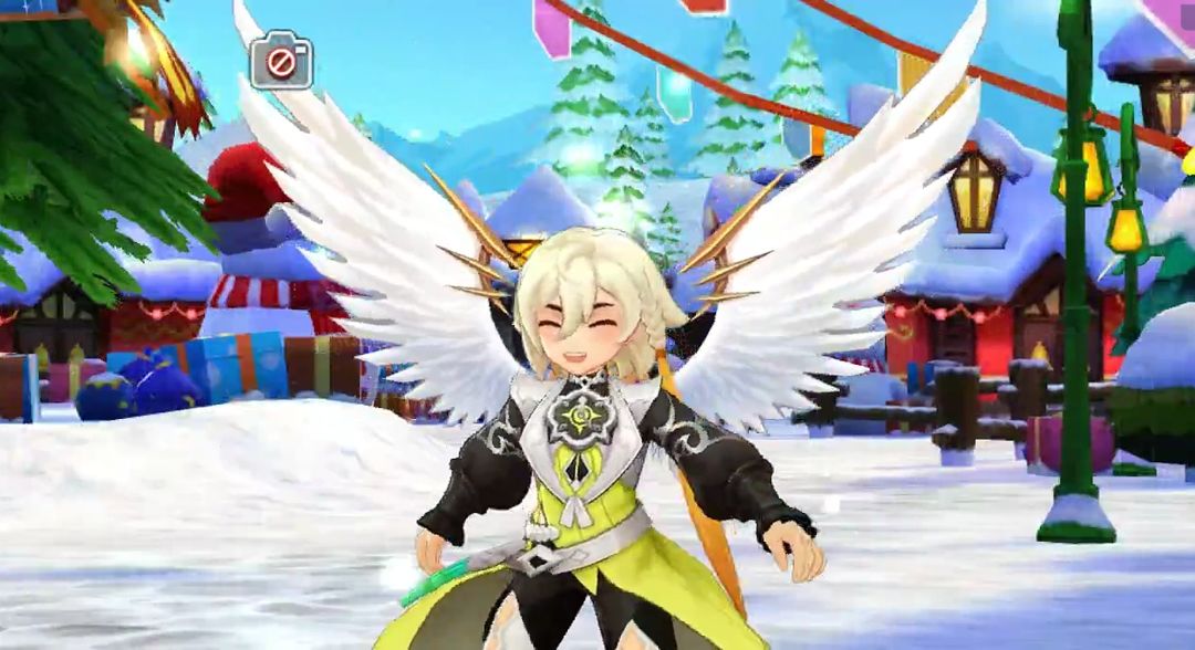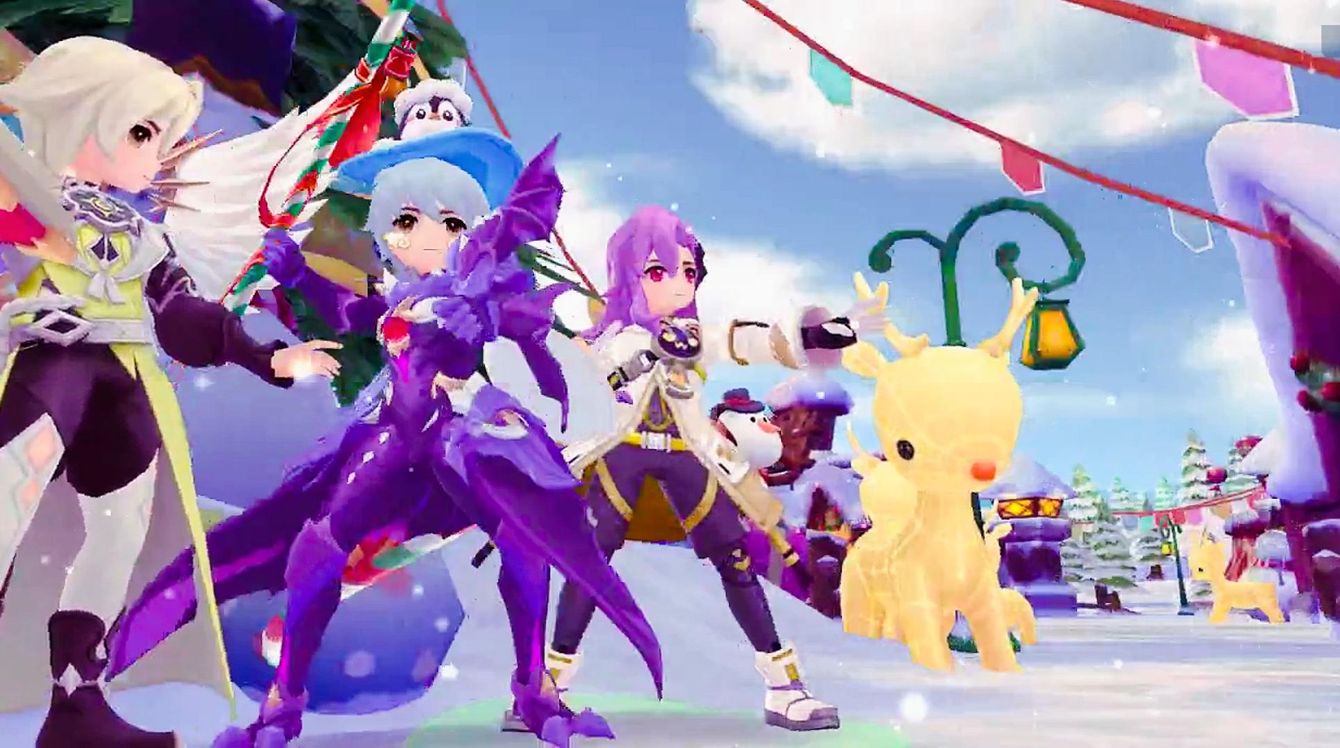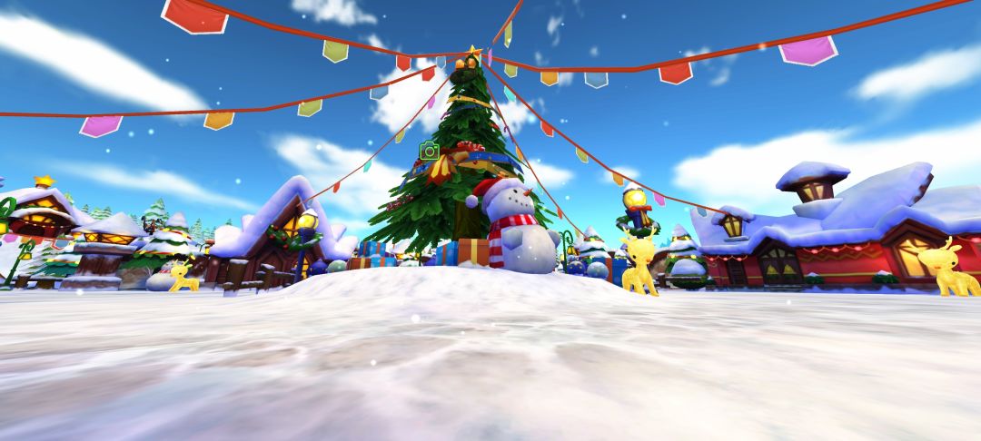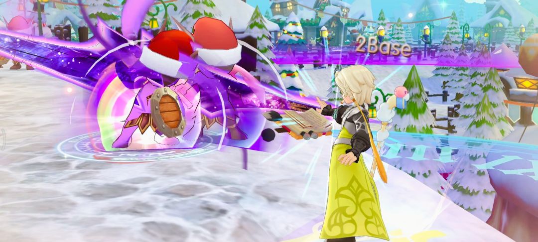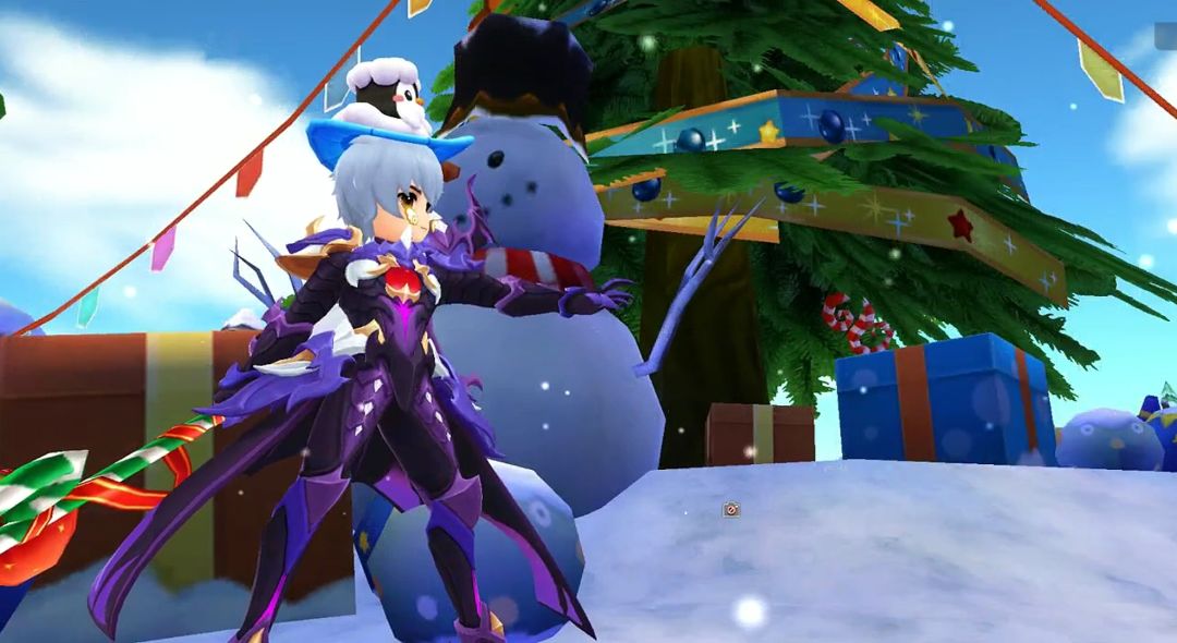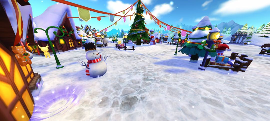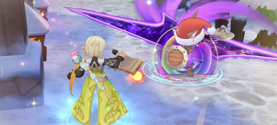 冒险者<我爱Ro>停下脚步,指向前方。在一座被冰霜覆盖的小广场中央,几只被铃铛唤醒的魔物正围着一棵小型的圣诞树乱撞,树上的彩灯摇摇欲坠。