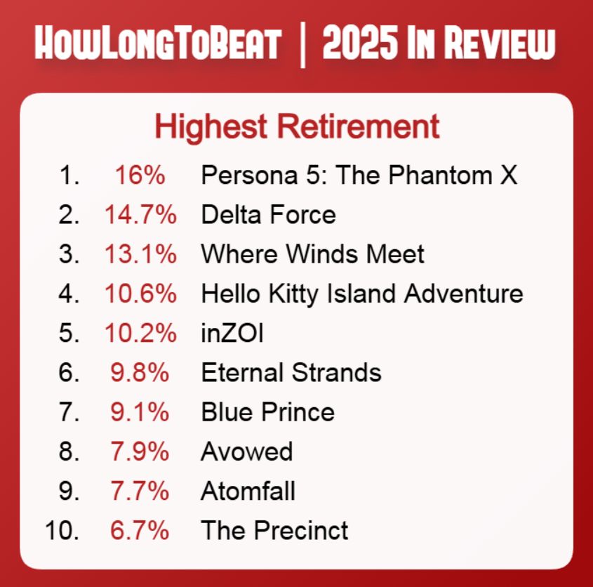 2025年全球退坑率最高的十大游戏出炉:国产游戏包揽前三