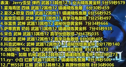 这位四姨选手,打造仅为武器12、全身10,这个打造在比赛中斩龙真的很难,换成武神红眼这些常规职业,基本想都不要想,当然也说明了四姨这个职业与镇魂精炼的完美适配,65技能和45技能的组合再配上鱼雕的续航,全程都在输出,无视土龙的一切机制
