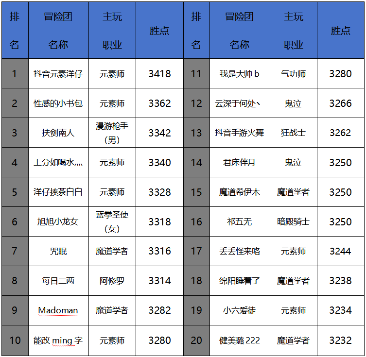 在这周的排行中也首次出现了四姨这个职业,这个职业是真的稀缺,从开服到现在pk一直在增强,难道这职业出现质变了吗?下周笔者会给大家摸摸底,看看究竟是怎么回事。