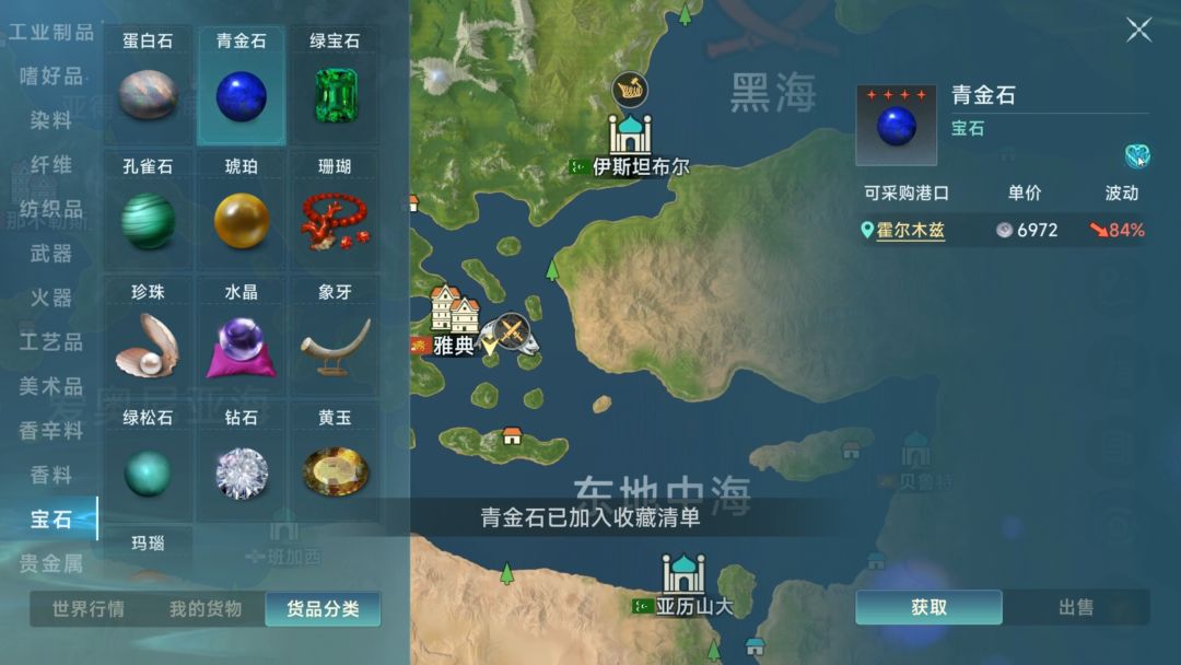 作为下版本价值最高的交易品,青金石预计将引发各国商人激烈争夺。伊比利亚文化圈内仅拉斯帕尔马斯与卡萨布兰卡具备竞争条件,其中拉斯帕尔马斯坐拥珊瑚,可触发宝石暴涨。若占有度不足,甚至无法实现两次抬价,竞争门槛明显提升。话不多说,请大家跟随我操作,打开右上角的小地图,于货品分类中定位以下七种交易品:金制工艺品、宝石工艺品、天鹅绒、乔其纱、火枪、天竺葵、青金石**