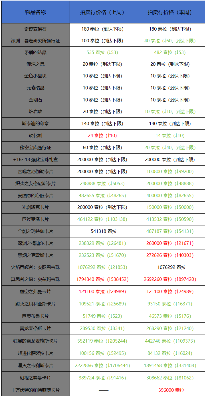 本周拍卖行大调整,其中深渊票、炉岩碳、神器卡片等下限价格大幅降低,这也导致这些道具的现存价格也变低了很多,好处是以前卖不出去,现在可以卖出去了,坏处是如果遇到消耗风口,赚的变少了
