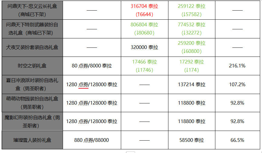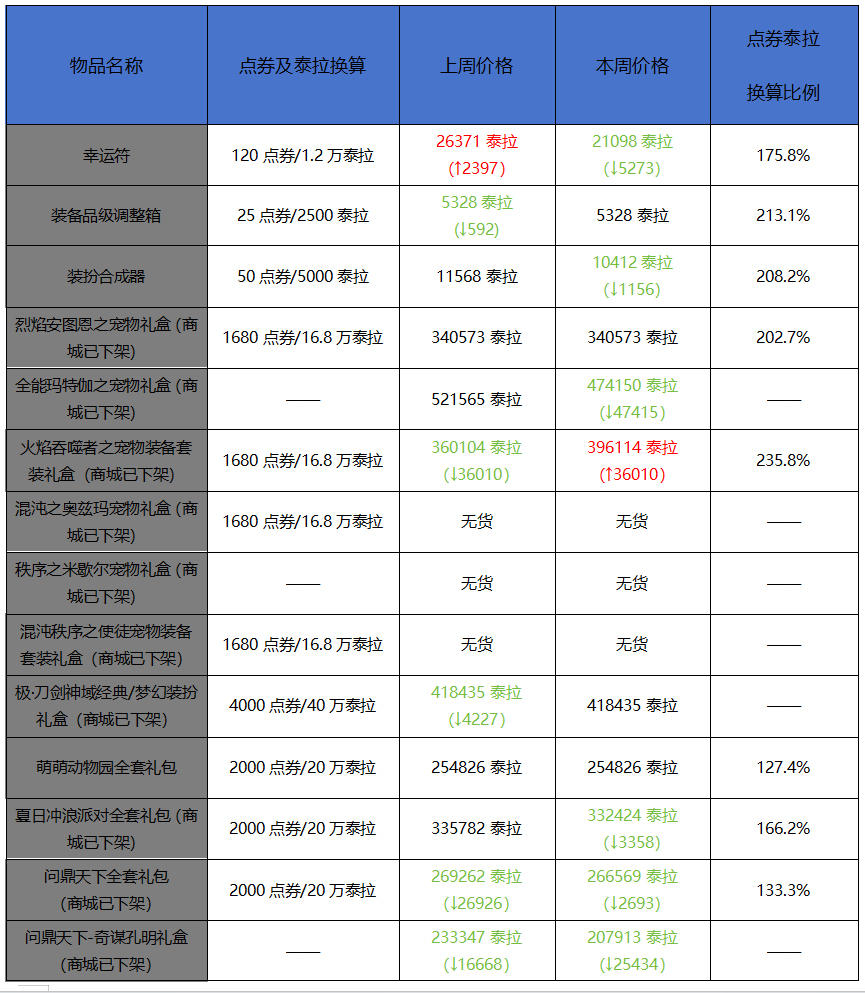 这周除新礼包外,其余道具降价的也比较多,近期点券换泰拉不太划算,氪金玩家可以再等等
