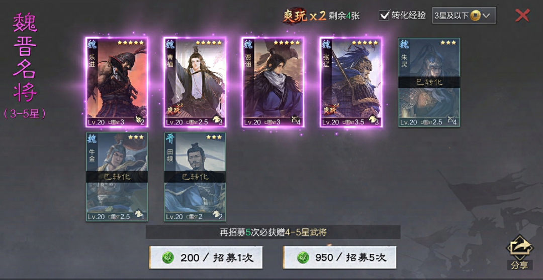 不过以上都不是最爽的,爽玩版真正让人欲罢不能的点,还是在于抽卡翻倍——名将卡包招募前10个五星武将时,可额外免费再获得一张同卡包的五星武将。
