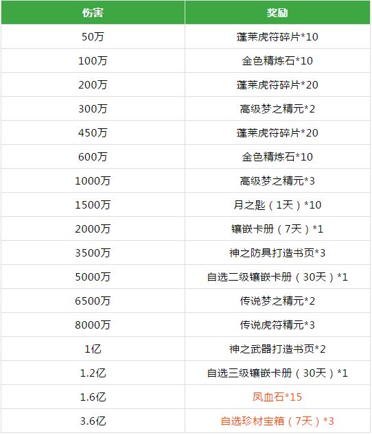 伤害达到3.6亿时更是可以获得自选珍材宝箱3个,里面的天地人翅膀材料都是非常珍惜的哦。