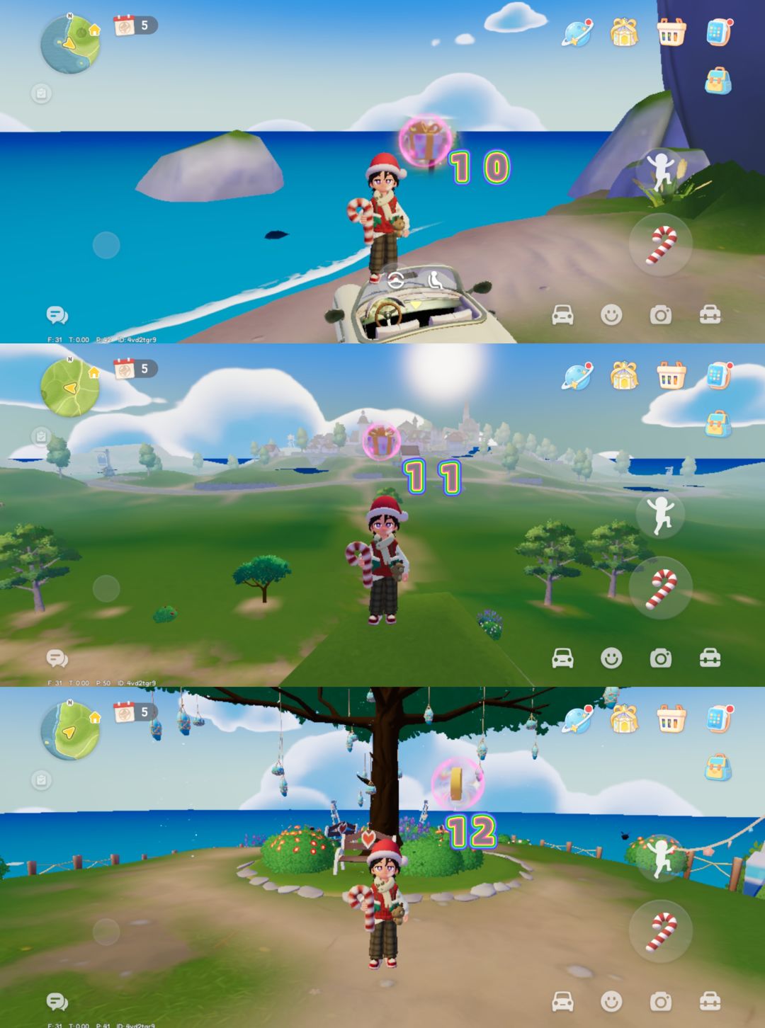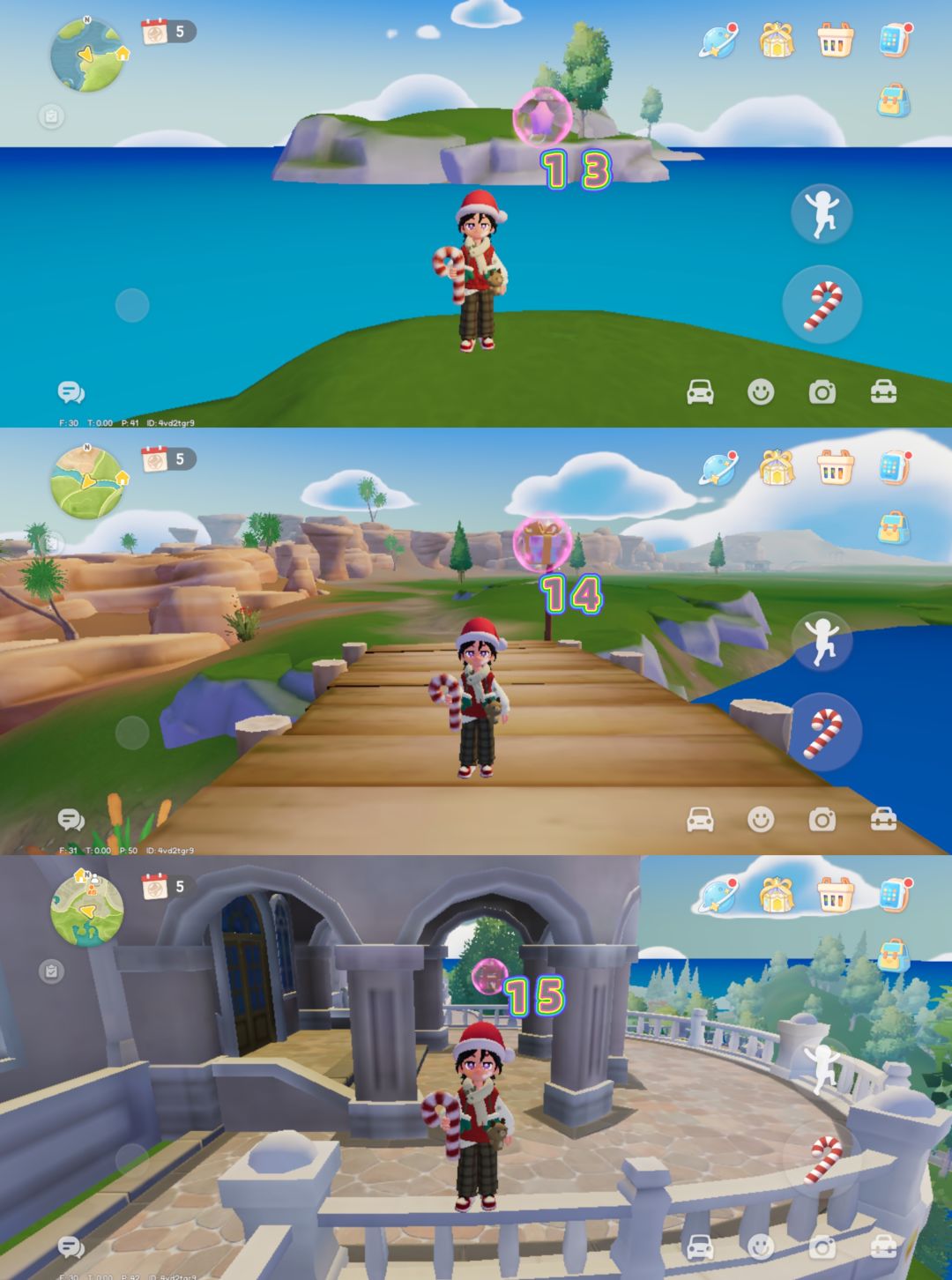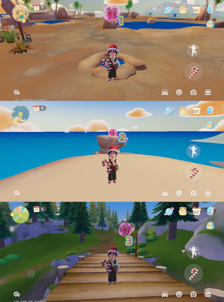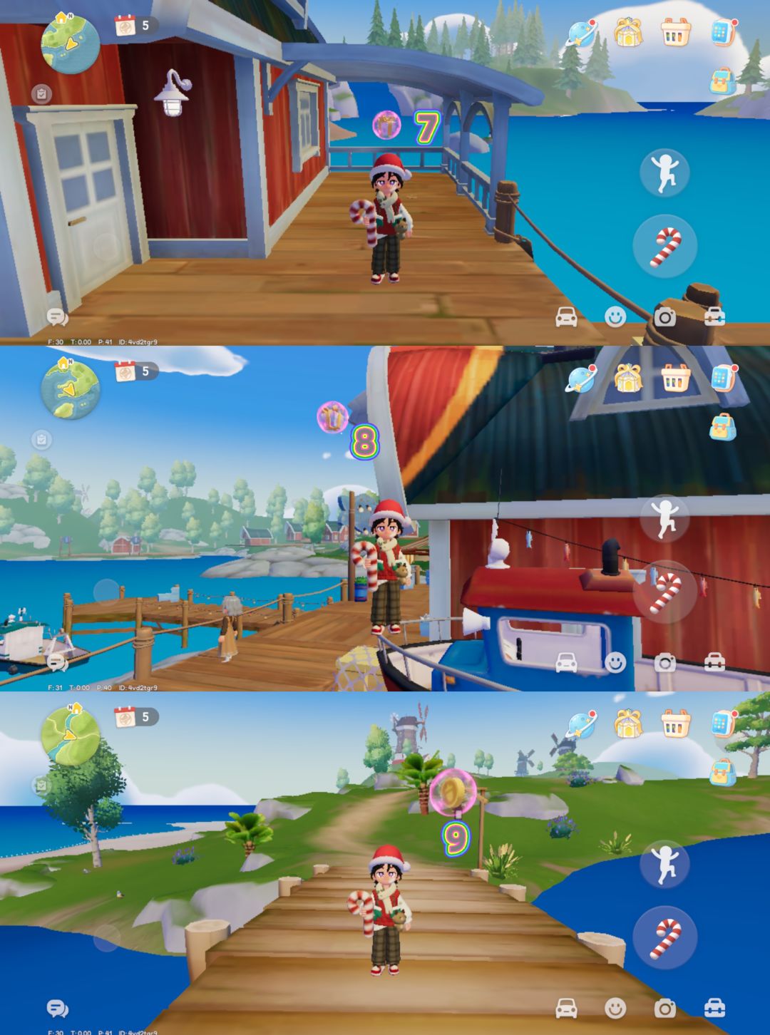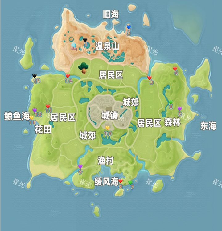 粉红泡泡(12.27-1.2)位置分布:图一地图的15处爱心标记,分别在温泉山3处(①号泡泡在温泉山湖旁的小温泉洞口)、森林3处、渔村3处、花田5处(⑬号泡泡会从对面飘过来)、城镇1处。 粉红泡泡里有随机送拼图盒子、家具、满愿星和材料!