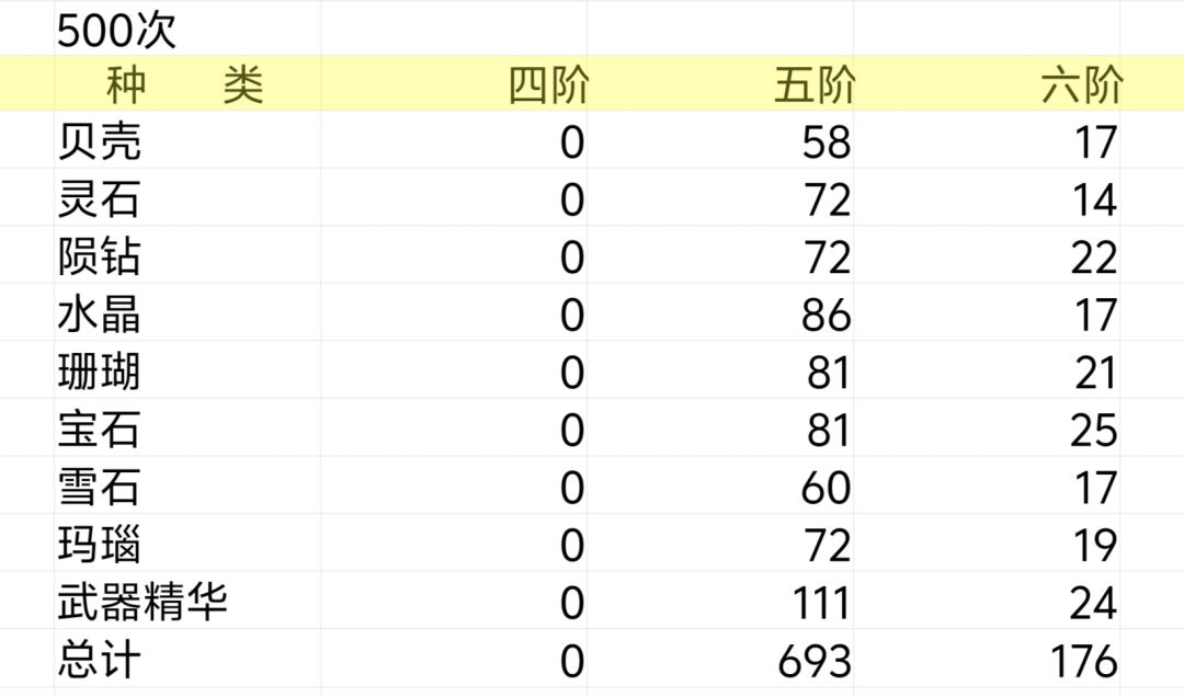 样本次数有限,单一随机事件波动性太大,直接拿武器精华数量计算难免偏差较大。换个角度统计,可以看到五阶和六阶材料掉落比例应该为4∶1,每种材料的掉率设置应该是1∶1,这里五阶贝壳和五阶武器精华恰巧成了两个极端,可以去掉一个最高分,去掉一个最低分。