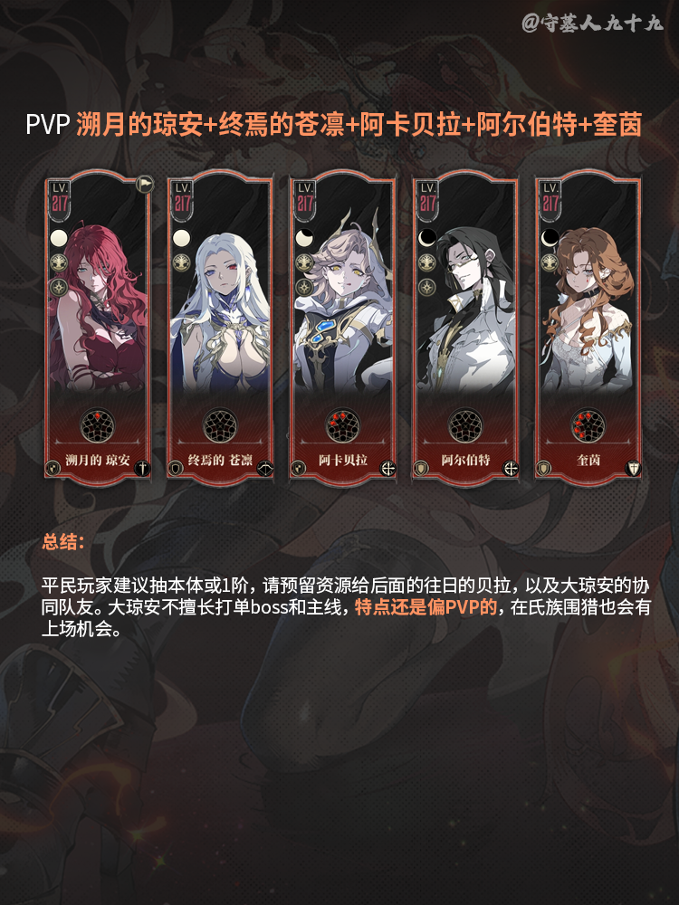 新手玩家依然建议使用艾斯缇莉薇娅血月队,或围绕着这次自选始祖终焉的苍凛组队,等1月9日的大贝拉,终苍+大贝拉+贝拉横扫主线和常规装备本。养成资源优先给主线队伍,pvp对平民零氪玩家而言收益不高,慎重抽取高命!!
