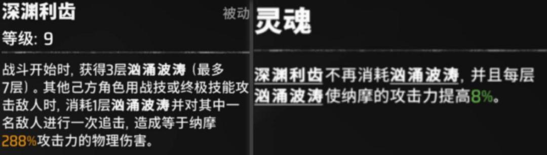 其它角色使用技能攻击敌人时,消耗1层并对其中一个敌人进行追击,造成288%攻击力的物伤。