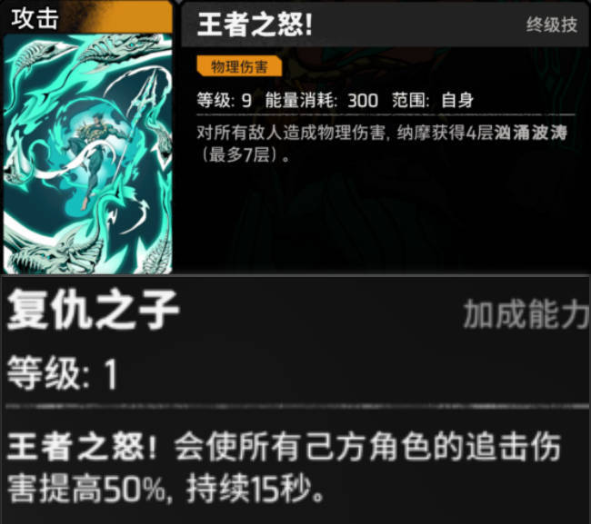 接着看看专属效果,纳摩的生命值大于等于50%时,追伤提高100%,小于时,【七海之主】的法力值消耗减少1点。这样的设计可能是让纳摩在血量健康的时候追求输出,而快死还能通过极低费的战技治疗,毕竟1点法力值夸张,属实是战斗与生存我都要。