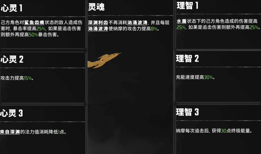 首先1,可以先解锁【心灵1】相比【理智1】,水盾的收益虽然能打更多敌人,而【鲨鱼齿痕】只是单体,但大众的都选择去打夜幕降临,我们也只是对方触手与克拉肯,所以【心灵1】是我推荐的,暴击率与暴伤又有。