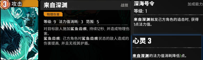 21级解锁天赋【深海号令】该战技触发已方角色的追击获得1点法力值,因此需要追击流派英雄,可以想象用技能补后,两位追击角色刚好吃上,那么你的【来自深渊】也仅仅只消耗1点法力,其它英雄又能继续发力。