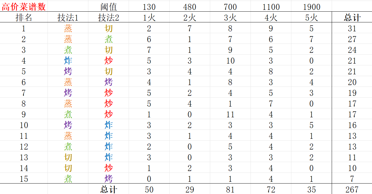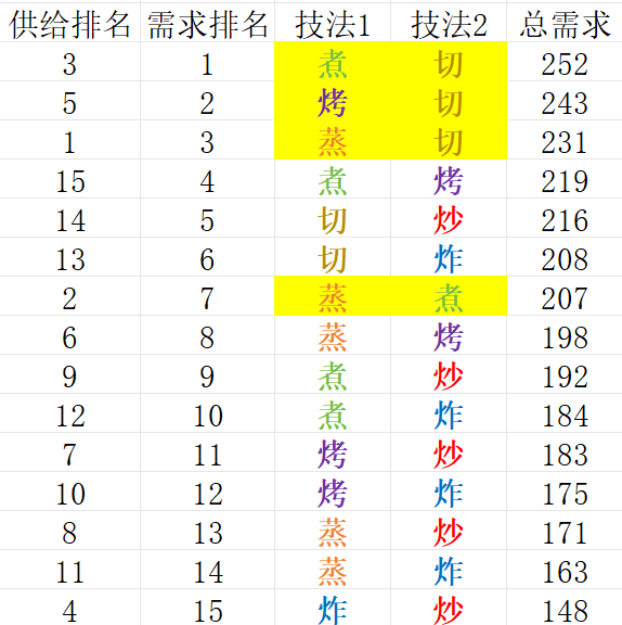 进而将菜谱供给和宴会需求结合来看,图4中,两者均处在前7的技法组合(黄色高亮)仅有4个:[煮切]、[烤切]、[蒸切]、[蒸煮]。而需求高的[烤煮]、[炒切]、[炸切]则因为菜谱供给垫底而整体强度堪忧。需要注意的是,该排名仅限于当前情况,倘若后续例如出了大量高价[烤煮]菜谱和高强度的[烤煮]厨师,那么[烤煮]仍有机会在宴会中大展拳脚。