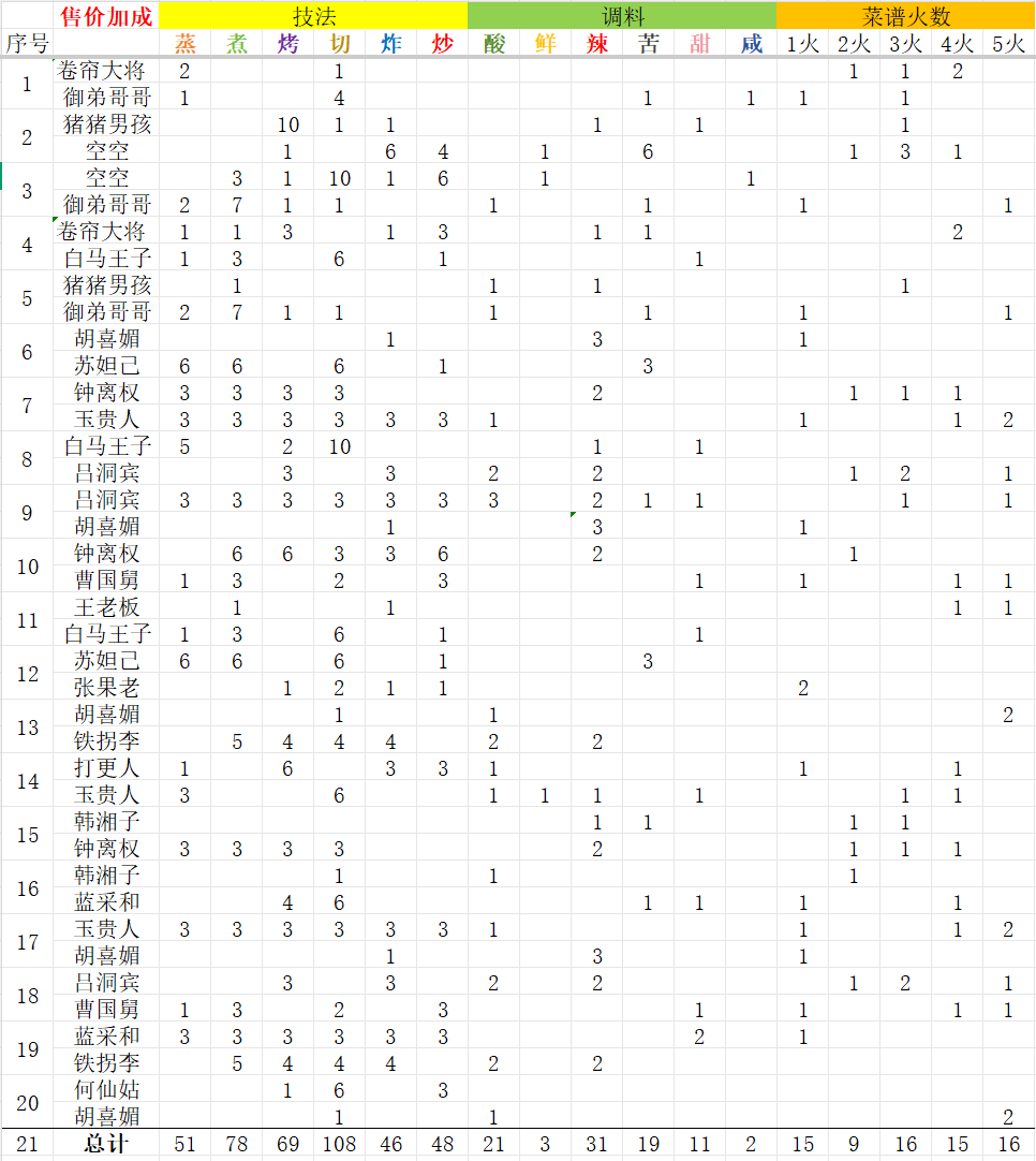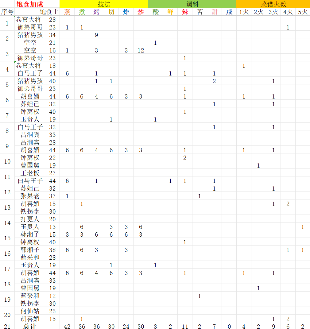 受论坛“5216”大佬提出的“虎神卫”(黑小虎、二郎神、卫青)、“黑神卫”(黑风大王、二郎神、卫青)等宴会厨阵容能够灵活应对绝大部分的风云宴并取得高分(甚至省级单满)的启发,我不禁好奇这种“烤切”菜厨体系在风云宴中具有高宴会强度(易取高分且具有普适性)的深层原因,即风云宴的贵客意图从厨师技法要求上是否就是以“烤切”为主。故本文想探究当前20种风云宴题型下,在总共480(20题*2贵客*3轮*4意图=480)个贵客意图中,对于涉及(需求)每种厨师技法的意图的比例分布。