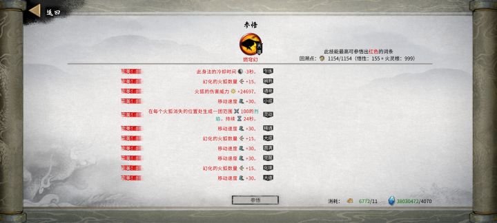 火身法核心词条:①此身法的冷却时间-3秒;②在每个火狐消失的位置处生成一团烈焰;③幻化的火狐数量+15。