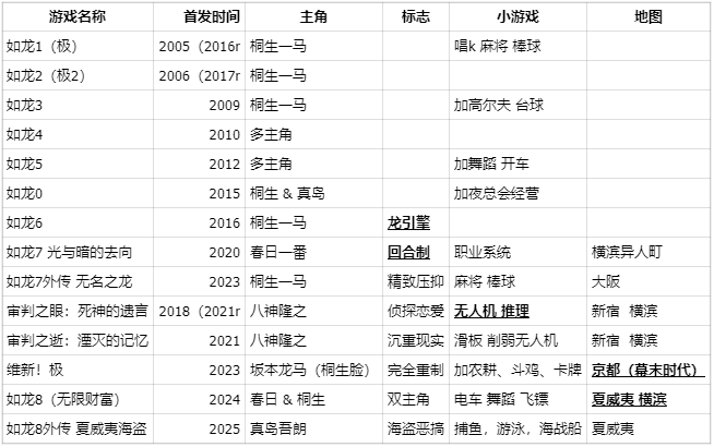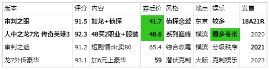 价格评分方面也有对比表,审判第2部那个dlc原价高评分低,第六代也有好价,但作为新引擎第一代,画质提升带来锯齿效果和打击感下降,也是回合制前的最后一代实时打击。目前好价是龙7正传,全套打包券后48,以及审判之眼。他们伴随的两部:龙7外传和审判之逝,就有点挑人了,改动创新也不是所有老玩家都能适应。对于收藏情怀来说,四部+龙6都是低价好时机。