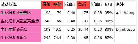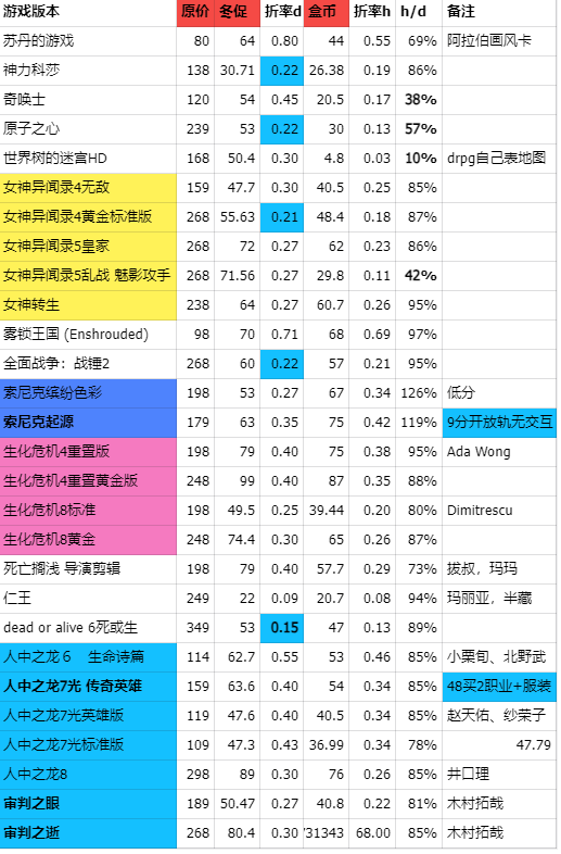 下面第一张完整表,红色3列是原价/冬促价/盒币价(澡堂价),筛选的是比较热销的50元以上产品,当时筛选的标准是本体折后超过50元(能用券),折扣在3折以下超值,碰到系列不同版本也列出标准/升级/豪华版本的价格(部分低于40元)