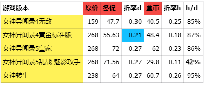 h/d这列是对比盒币抵扣vs用券前冬促价的折扣率,如果数值高说明值得用券,比值低则不如hb购买。这里的盒币是广义(包含但不限于盒币抵扣/便宜市场折扣),之前帖子写过,有兴趣可以去找。