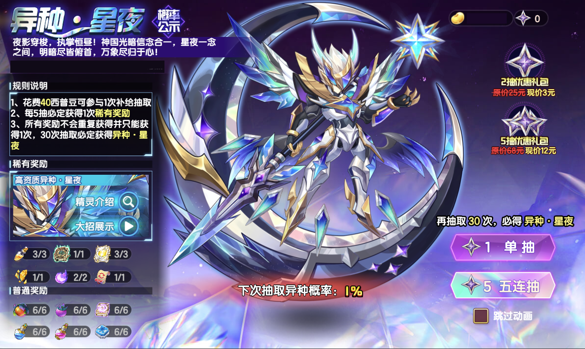 花费西普豆可参与一次补给抽取,每次抽取将有机会获得大型经验果、蓝之星纹、紫色星魂秘药等普通奖励,或异种精灵·星夜、资质药水、同源置换卷轴等稀有奖励,抽取5次必定获得1次稀有奖励。除此之外,还为小西普们准备了超值2抽以及5抽优惠礼包!此次异种精灵·星夜的专属绝招特效也将同步上线。