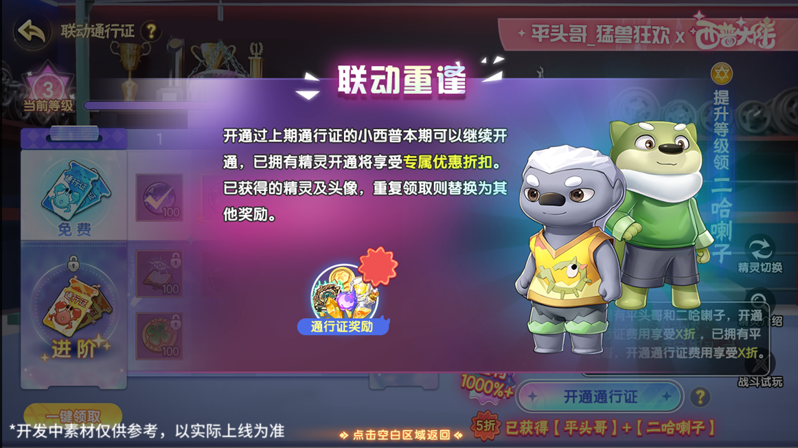 联动专属通行证上线!在活动期间内,完成任务提升通行证等级可免费领取平头哥、二哈喇子纪念头像以及联动表情包;购买高级通行证即可获得精灵·平头哥,提升通行证等级还可获得精灵·二哈喇子以及联动聊天框、联动拼图等奖励!若已拥有平头哥或二哈喇子其中一只的小西普,再次购买该通行证仅需花费49元;若已同时拥有平头哥和二哈喇子的小西普,再次购买联动通行证仅需花费30元。