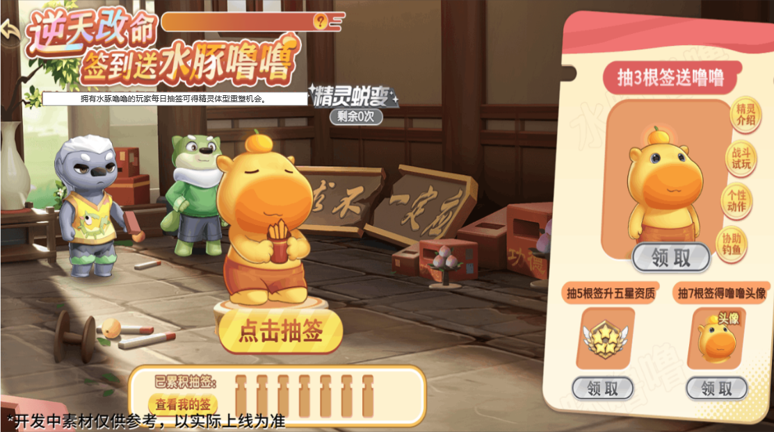 七日签到开启,累计签到抽取三根签即可获得可爱的精灵·水豚噜噜,累计签到五天可将精灵·水豚噜噜直升至五星资质,累计签到七天可获得联动精灵纪念头像!本次将限时发放精灵体型重塑机会,小西普可以在获得精灵·水豚噜噜后,通过参与签到领取机会,在签到活动内的”精灵蜕变”可进行体型重塑!