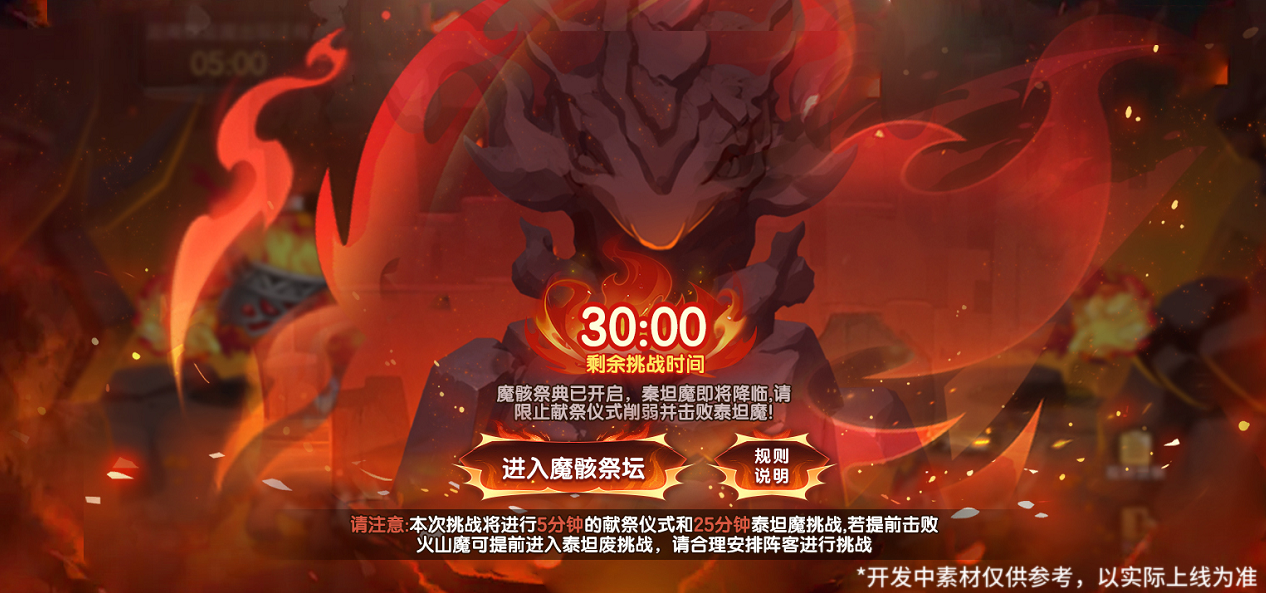 献祭仪式:此阶段火山魔将不断召唤使徒,使徒会献祭自身提升魔骸之门的温度,需清除使徒阻止魔骸之门持续升高。献祭仪式结束后进入泰坦魔挑战阶段。