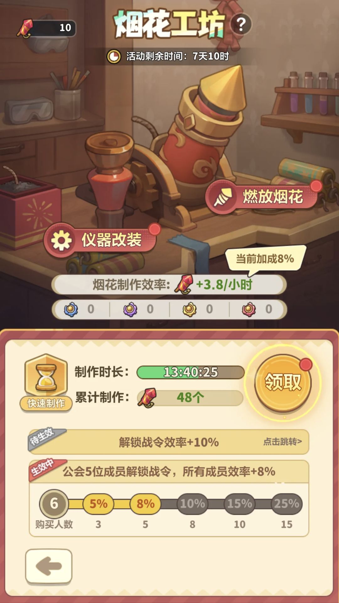 1、安装齿轮可提高烟花制作仪器的制作效率,最多可累计24小时的制作收益;