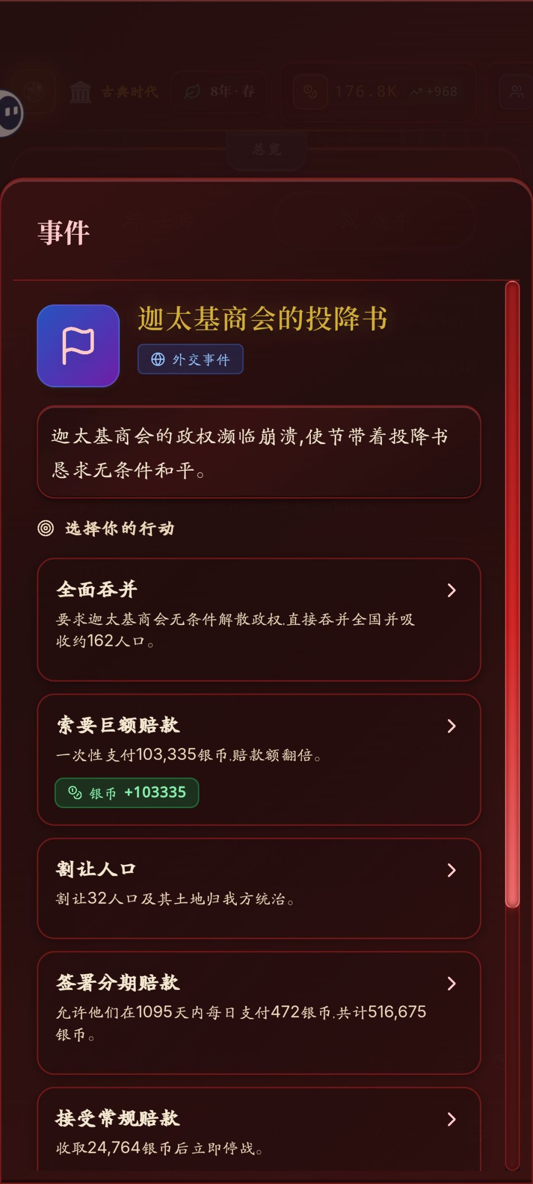 🔟打仗过程中,其他国会来求和,全部拒绝(除非对面兵力高,再打下去打不过)。等战争分到350,出现吞并选项之后,就可以答应了。别选吞并!!!我们的目的是发战争财,把别的国家当血包养,一定要选分期付款