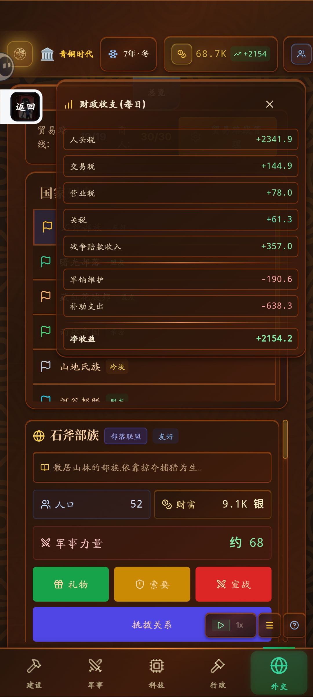 7️⃣这时会发现商人暴利,别人都赚3-5,商人能赚20-400,狠狠加人头税,让他们收入在10-30左右就行。不满就减税、收买,平静再加回来。我的商人在温饱水平左右,不闹事就行