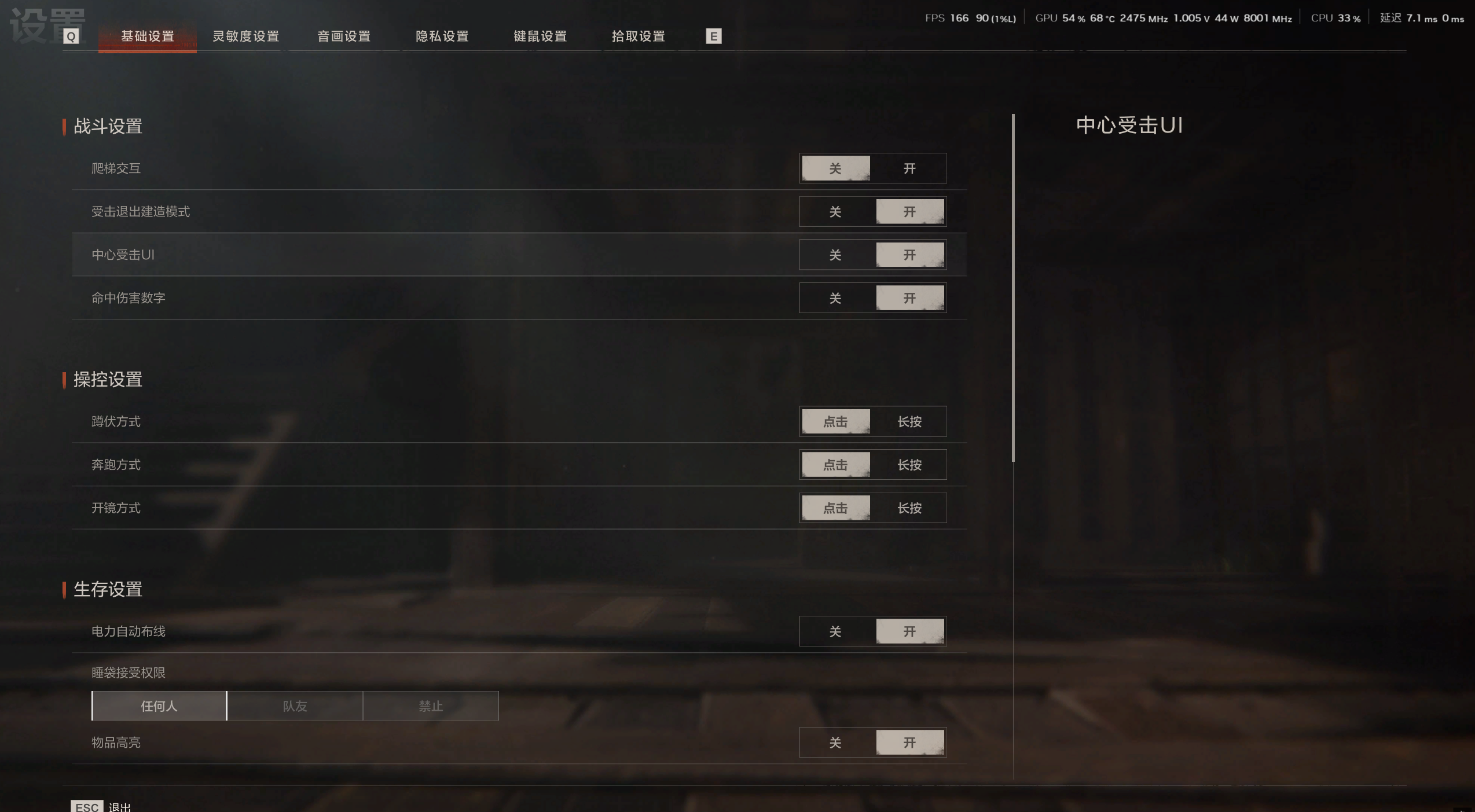 首先是基础设置,这里我们需要着重调整两个设置,第一个就是受击退出建造模式,能够有效防止玩家被偷袭无法还手的情况,第二个就是中心受击UI和命中伤害数字,这个能够规避自己和敌人对枪时造成的伤害,防止出现伤害免疫的情