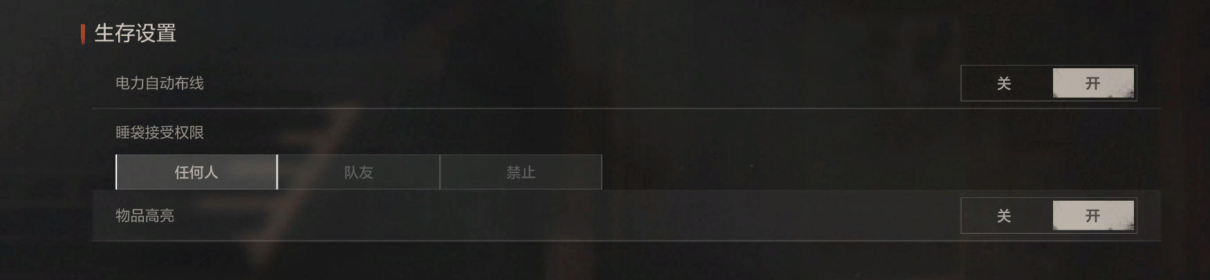 基础设置中的生存设置也是十分重要的一项,电力自动布线能够帮助新手玩家自动排列电线不用担心电线影响整体家的美观,而物品高亮能够很好的提醒玩家隐藏在角落的战利品,防止因为马虎没注意到战利品。