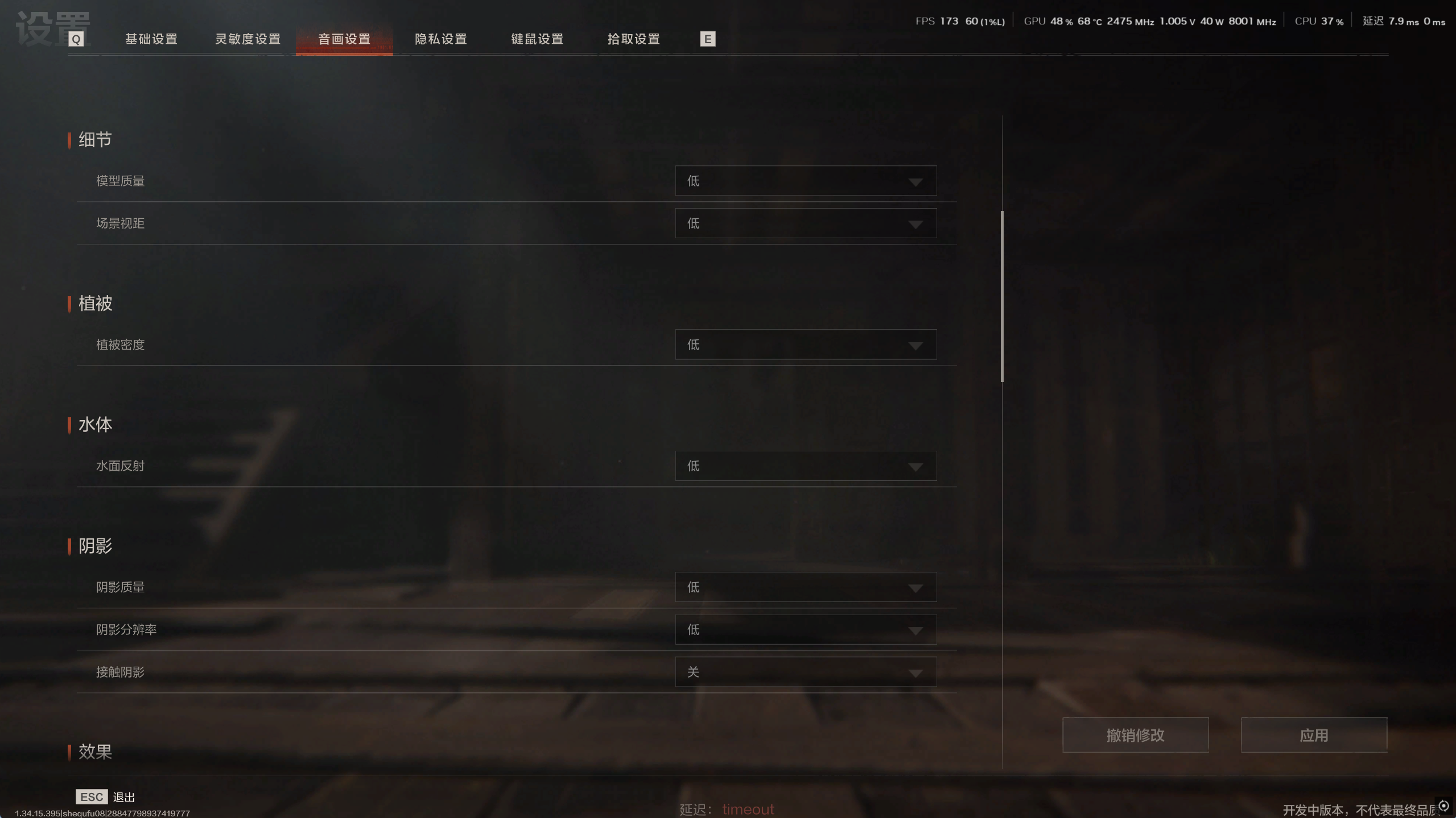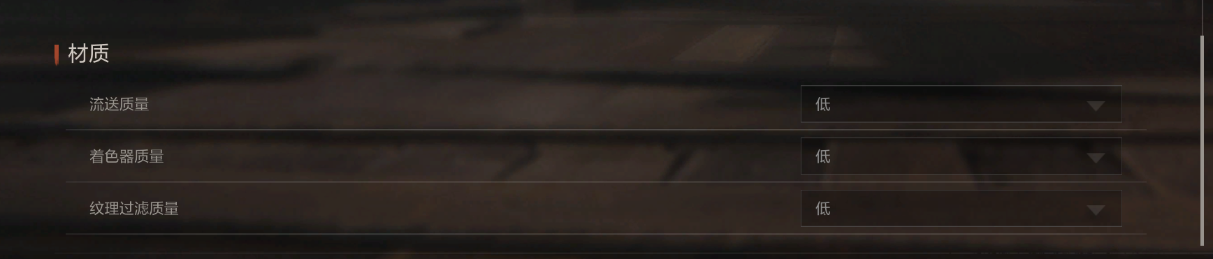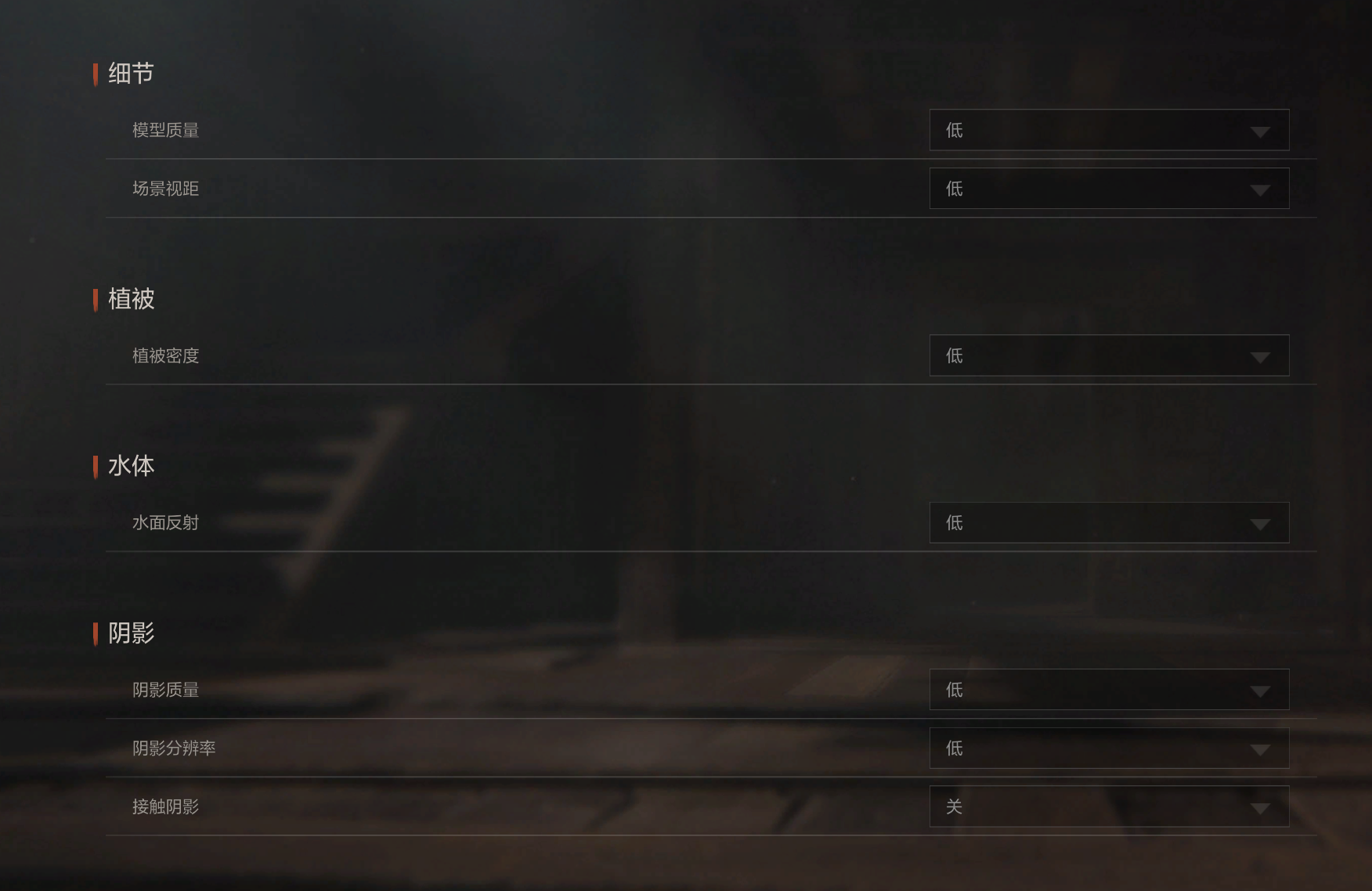 然后就是最重要的画面设置,小编这里是将所有的画面全部设置为最低,这样不会造成电脑因为过热导致闪退的情况,并且游戏的优化现在还处在测试阶段,不能完美适配我们的机型,降低画面质量也能很好规避这类问题。并且我们可以看到,最调节到最低画质后,其实游戏中的实际画面并不是完全无法游玩,并且少了光影等效果也让玩家能够更好的看清远处的敌人,这也是低画质的优势。