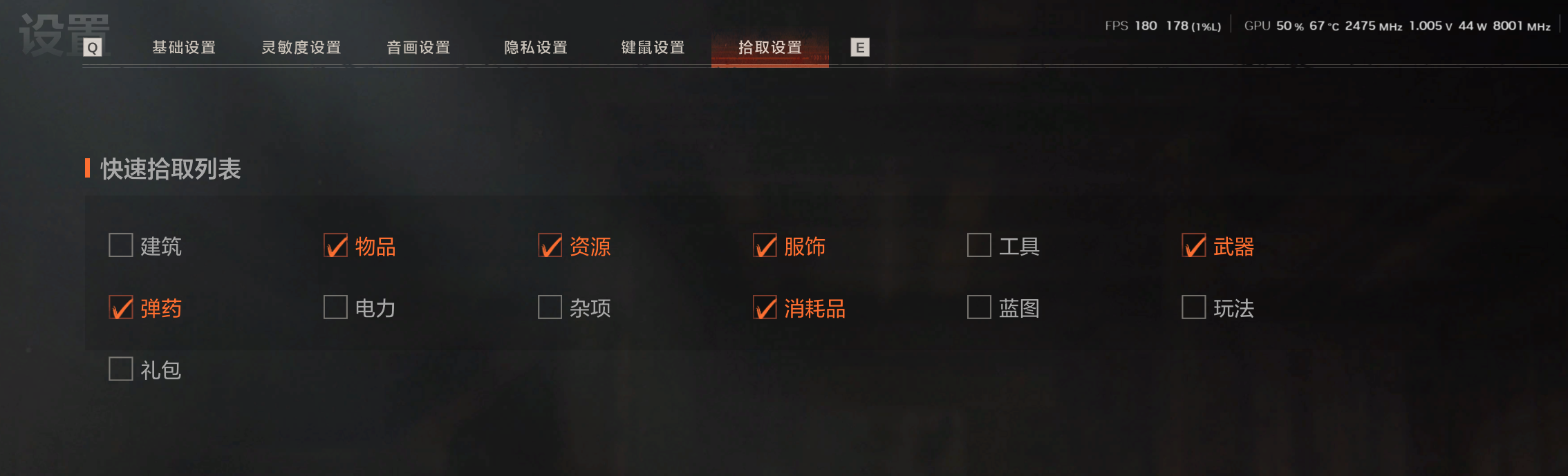 最后就是咱们的拾取设置,这里是用于快速拾取物资时选择的东西,基本上我们拾取的时候这些才是重要的物资,其余未被勾选上的内容一般是玩家不需要的,捡起来是占用背包,如果有重要的也可以玩家自己手动操作拾取,对战斗上的影响不大。