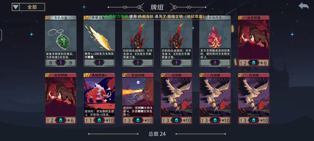 卡组构筑:开局删1尖牙野猪1狂暴野熊 抽两次生物/魔法 一次装备 主拿2~3费的进场生物/过牌/清场卡 装备主拿过牌/清场 注意不要拿沉沦魔 黑塔费用本来就紧缺 压自己费很可能把自己害死 另外过牌也很重要 生物核最怕的就是被清场 要是这时候没手卡那就是等死 所以最好拿2~3张过牌 再加一张过牌装备比较稳妥 然后key卡 天使之翼/雷霆术士/火焰符文 前两张是主要输出手段 火焰符文是清场神器 但也要拿地炎戒指 炎龙角等卡补伤害