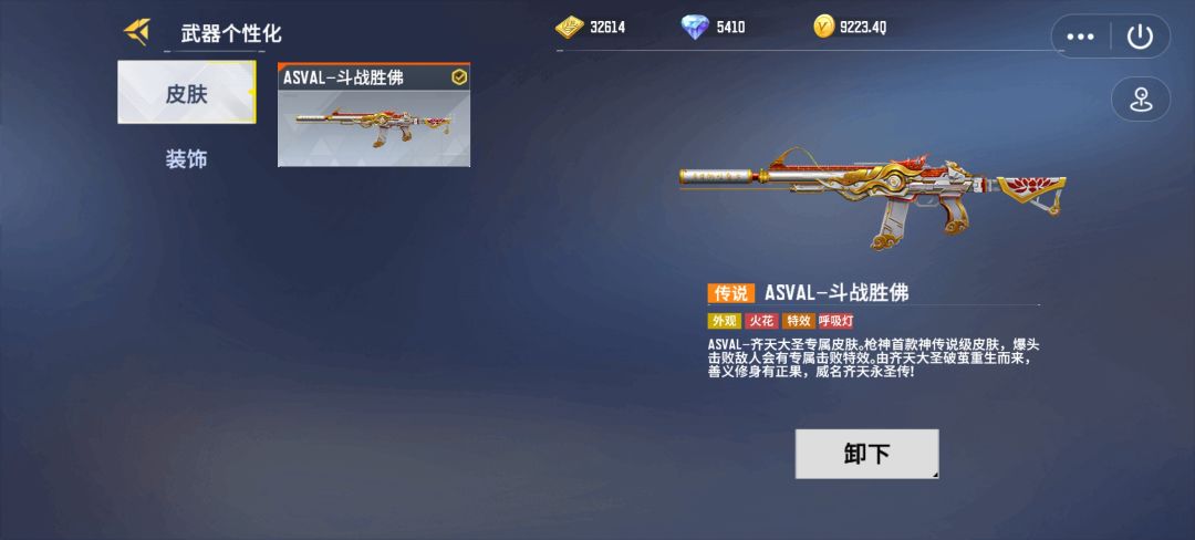 作为该款步枪唯一的传说级专属皮肤,当玩家爆头击败敌人时,会有专属的击败特效,呈现出齐天大圣破茧重生的画面,伴有“善义修身有正果,威名齐天永圣传”的击杀效果。