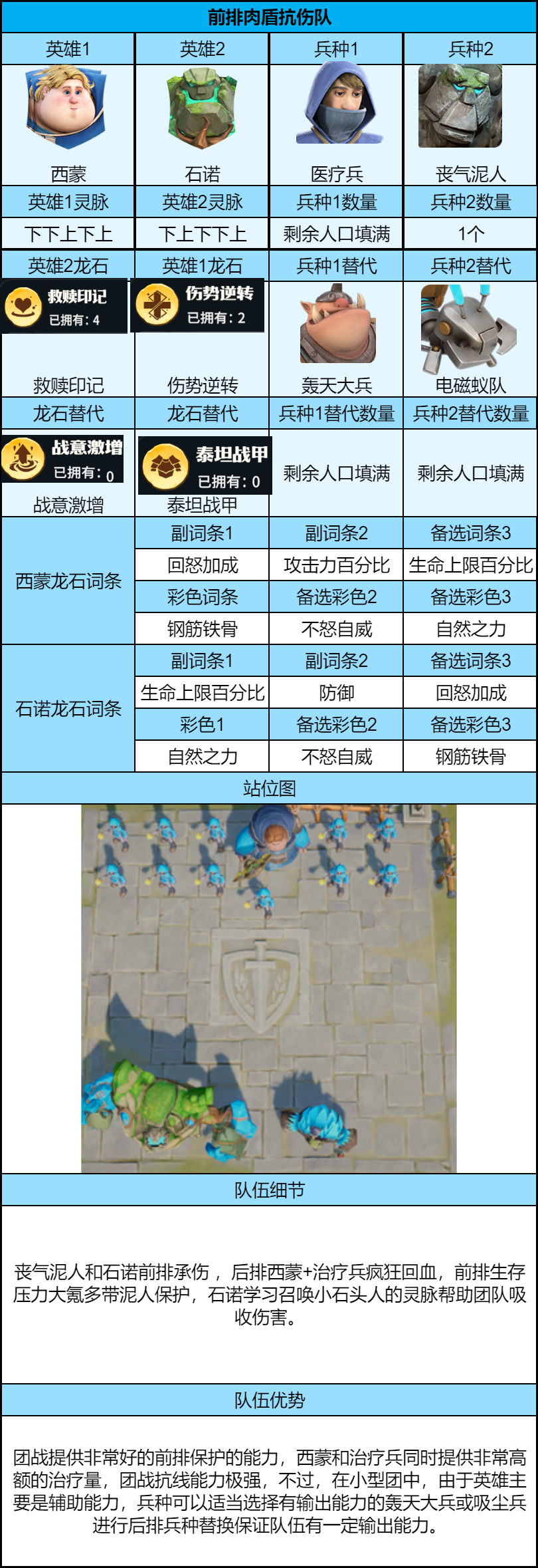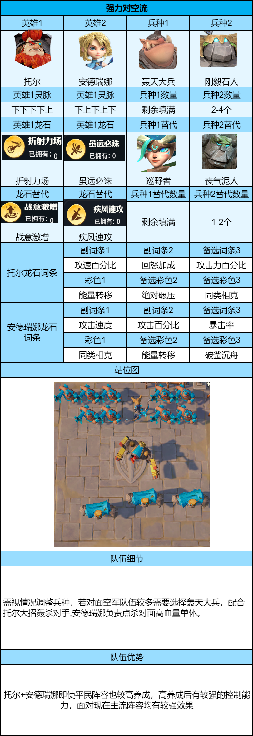 低养成优先走团战体系,前两队保证基础单军能力,后续队伍全力侧重团战养成;推荐平民优先练低配高能阵容,特里丝补强输出核心,搭配艾璐卡体系强度拉满,新英雄格罗、杜罗携手斯卡卡团战也超猛,另外罗宾 + 布巴、安德瑞娜 + 托尔、西蒙 + 石诺也是优选;S7 兵种轮换缺少巨力橡果、腐化橡果、自爆蚁队、黑翼幼龙、暗影卫兵,其中巨力橡果对开荒影响较大,可用巡野者替代,自爆蚁队换电磁蚁队即可,密林掠食者、洞穴吸尘兵等强力兵种依旧能用,配队时可优先侧重配置。