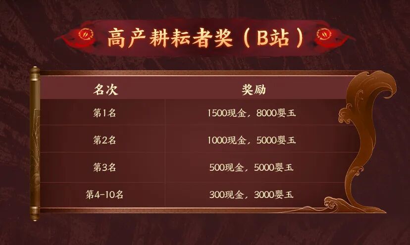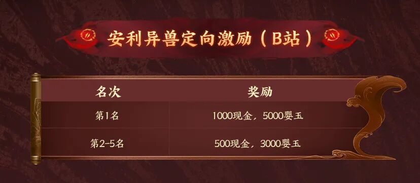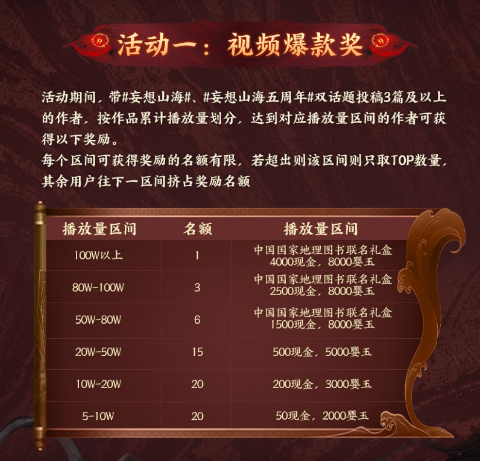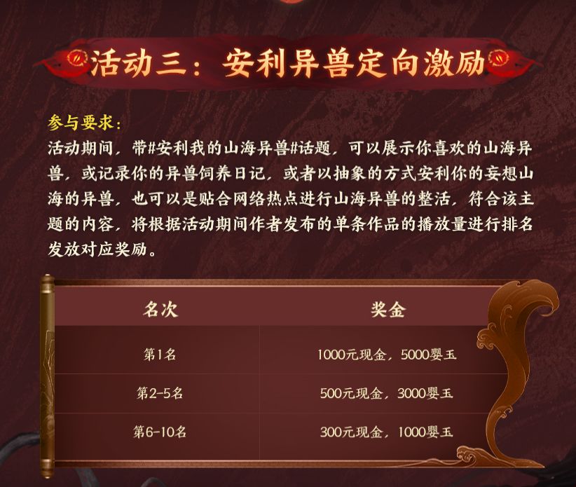 带#安利我的山海异兽#话题,根据活动期间作者发布的单条作品的播放量进行排名发放对应奖励。