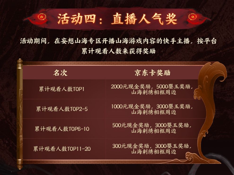 ● 喜欢直播的旅者可以参加快手平台的妄想山海直播活动。活动期间,在妄想山海专区开播山海游戏内容的主播,可按平台累计观看人数获得对应奖励。(PS:山海刺绣相框实体周边奖励仅直播人气奖可获得)