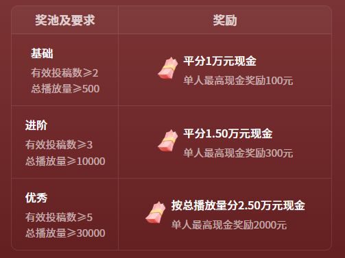 本次抖音的视频投稿活动奖励为瓜分模式,一共设有3个奖池,分别是基础、进阶、优秀,符合奖项要求的作者,可共同瓜分5万元现金奖池。以上三个奖池的具体奖励内容、参与要求和瓜分规则如下: