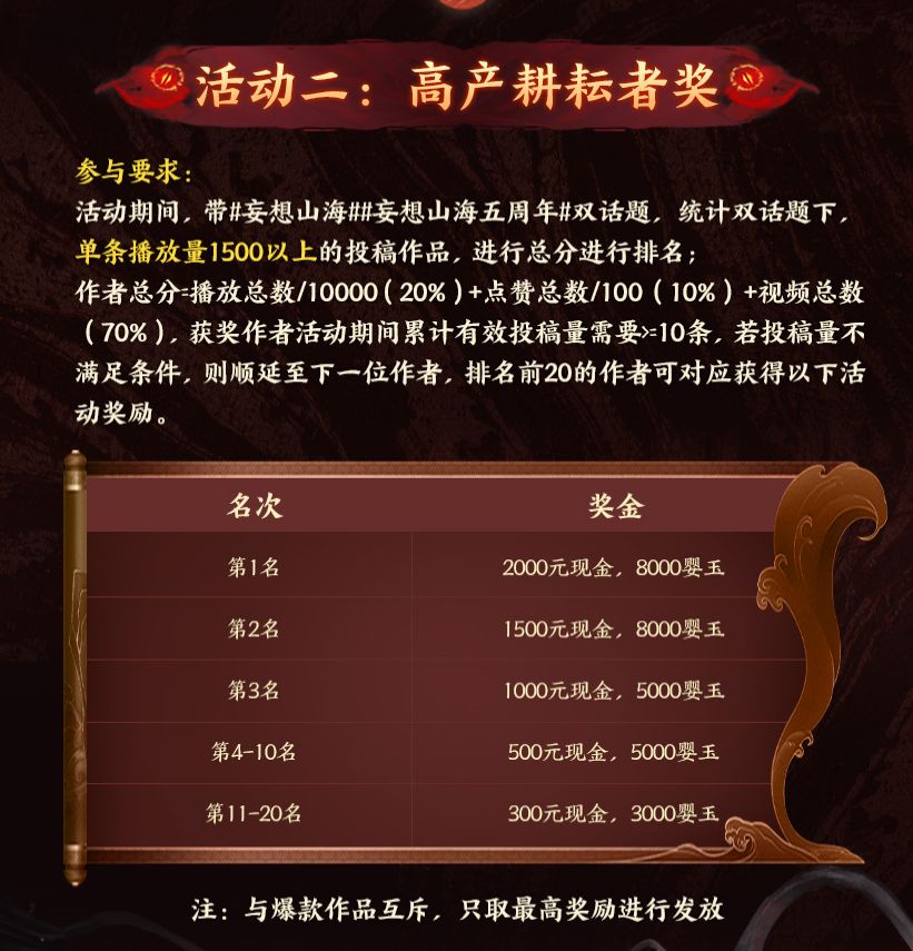 带有#妄想山海#和#妄想山海五周年庆#双话题,投稿3篇及以上的作者,按作品累计播放数倒序排名,前20名作者可获得以下奖励。