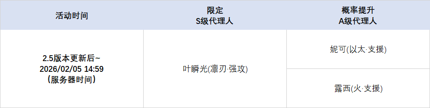 活动期间,限定S级代理人[叶瞬光(凛刃·强攻)]以及A级代理人[妮可(以太·支援)]、[露西(火·支援)]的调频获取概率将大幅提升!