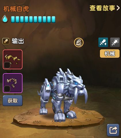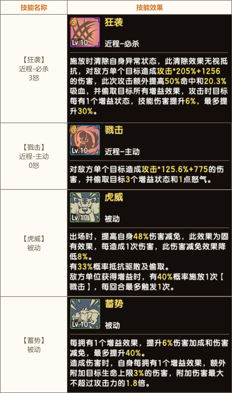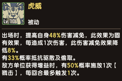 ※机械白虎被动技能【虎威】技能效果:敌方单位获得增益时,有50%概率施放1次【戮击】。