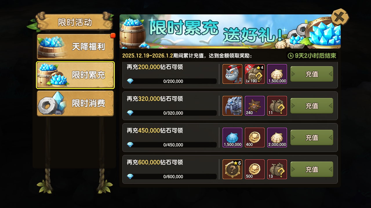 3.维护后 至 2026年1月2日6:00开启登录有礼、限时累充、幸运转盘以及限购礼包活动,详情: 【限时活动】12月19日限时活动