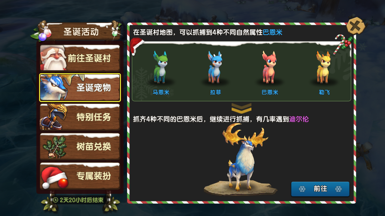 活动期间,可以在圣诞村抓捕4种不同自然属性的巴恩米,抓齐4种不同的巴恩米后,继续进行抓捕,有几率遇到迪尔伦