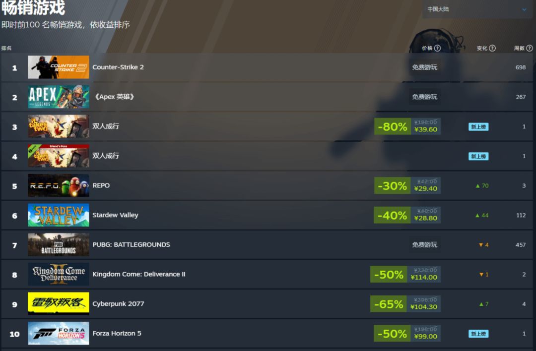 12月27日Steam平台畅销榜单新鲜出炉,除去免费游戏榜单后,95%好评神作《双人成行》成功登顶热销榜,成为冬促期间玩家追捧的热门佳作。