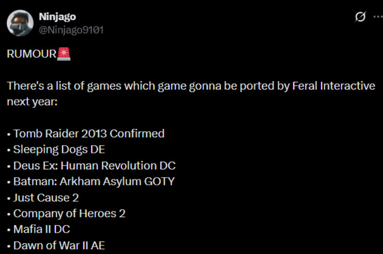 近日国外游戏推主@Ninjago9101重磅爆料,知名发行商Feral Interactive计划于2026年,将多款经典游戏移植至Android与iOS移动端平台,消息一出便让手游玩家充满期待。