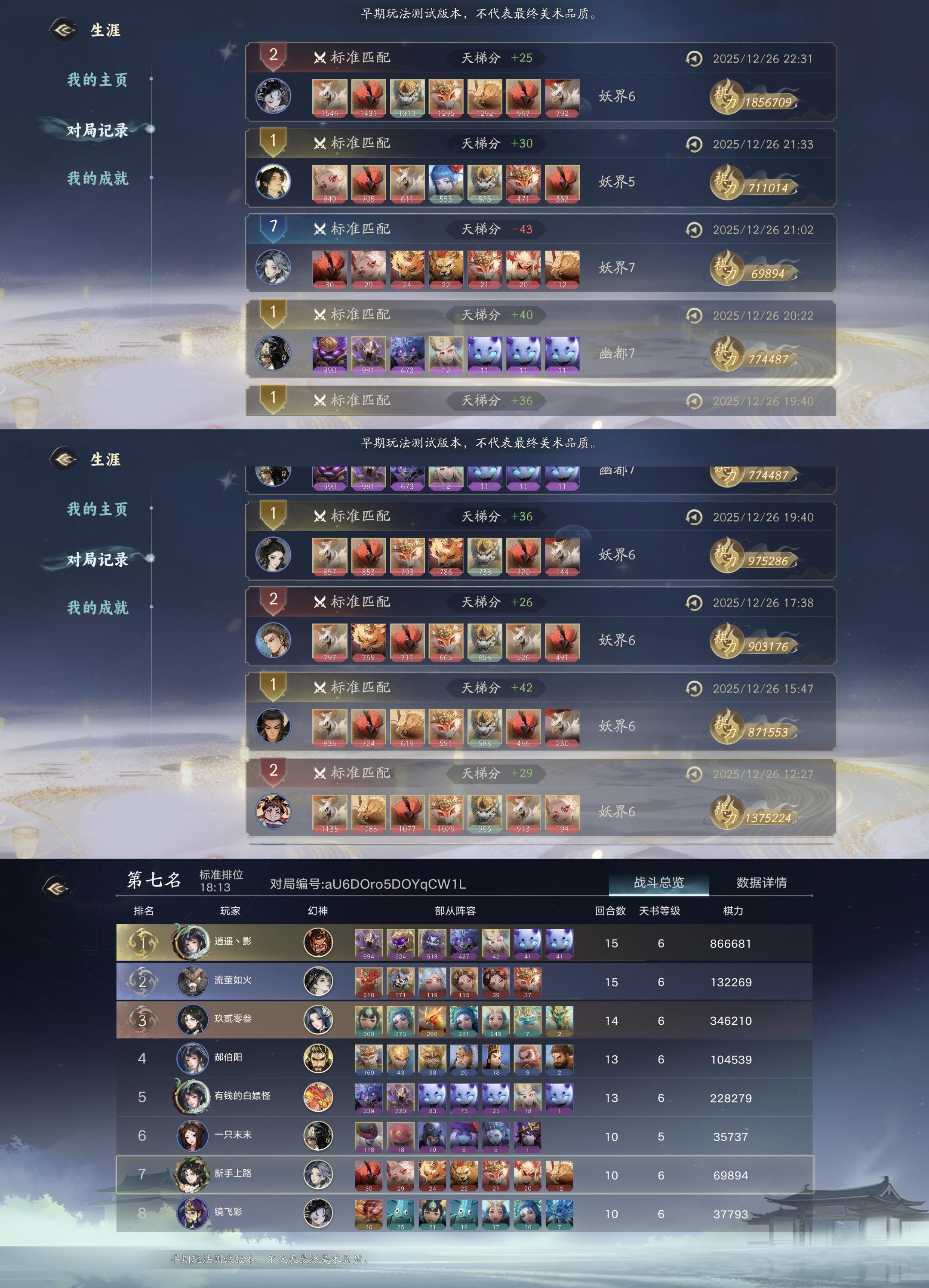 闲话少说,妖族消费骑的优点就是前中期战力提升相对比较稳定,特别是三本的鸟妖,四本的雷鸟怪,五本的羽翼天魔,看到必拿,只需要花费金币就能提升,战力提升平稳,有一定下限,更容易维持血量健康,保证即使碰到一两个胡狗也不至于一下子残血,打乱后续节奏。按我最近两天的经验,十五回合,如果不是发牌员故意针对,最起码也能保证大几十万到一百万的战力,非常稳定。(具体参考下图,这是我昨天打的连续八局,除了一场没有妖族,一场白蛇想追求上限,连续跳本,结果连着两局碰到压力怪,玩砸了,10回合就直接被送走了)